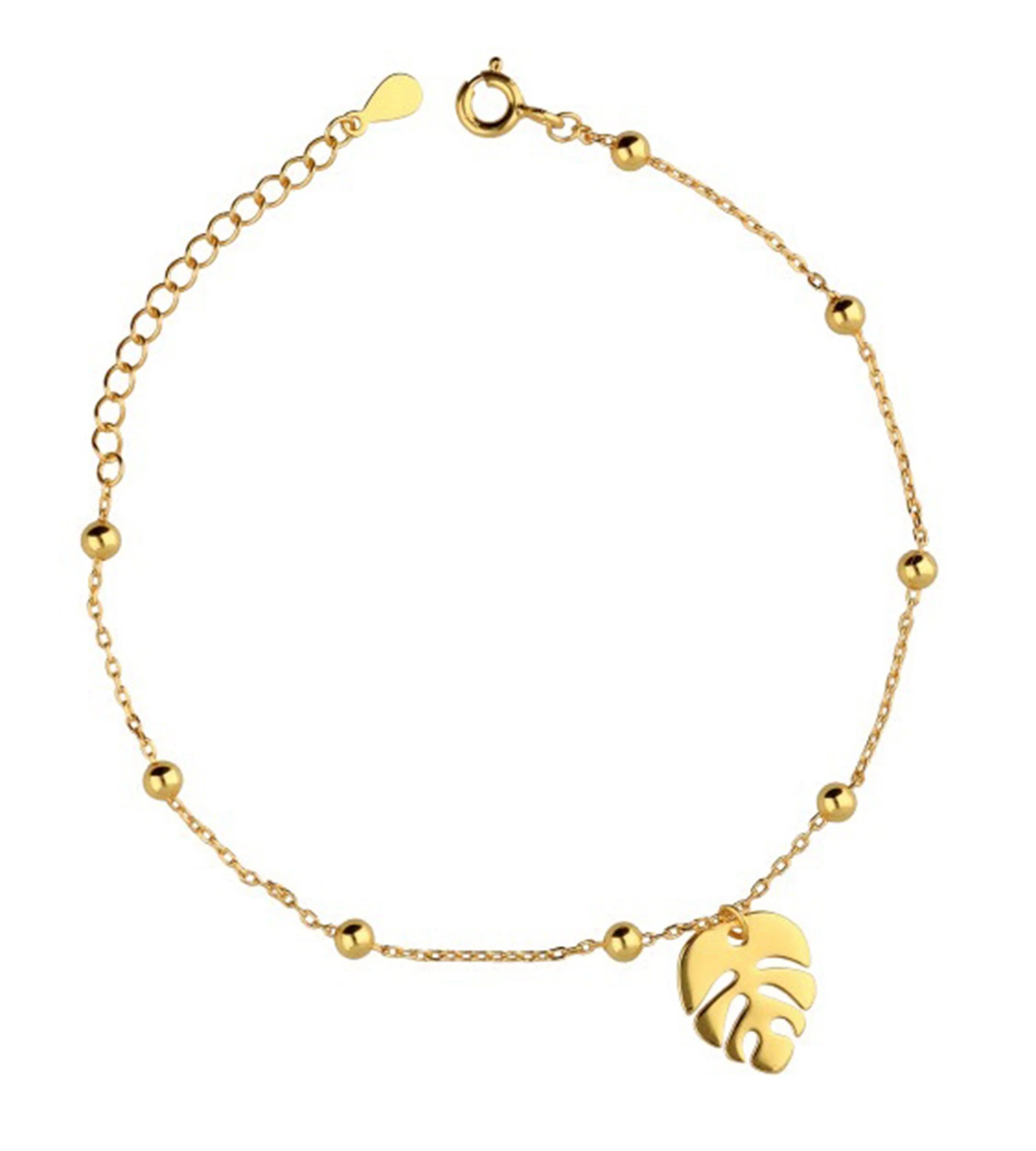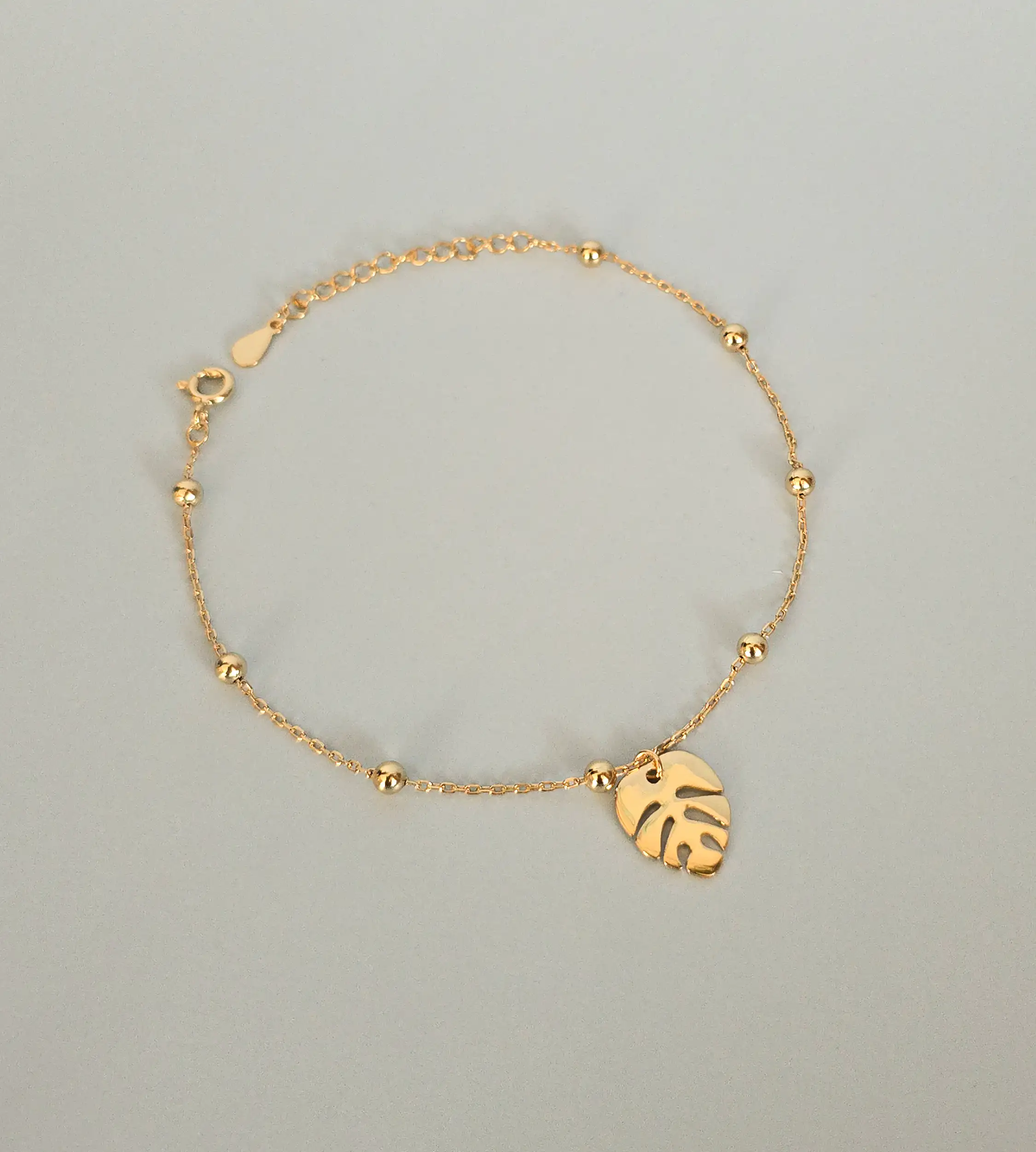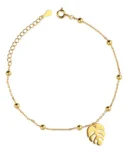 Złota bransoletka z liściem monstery i kulkami. Wykonana ze srebra 925 pozłacanego 14k złotem. Subtelna, regulowana i bardzo kobieca.