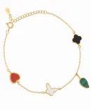 Pozłacana bransoletka ze srebra próby 925 to połączenie nowoczesnej formy z subtelnym nawiązaniem do klasyki. Delikatny łańcuszek zdobią cztery urokliwe charmsy z emalią – serce w odcieniu głębokiej czerwieni, biały motyl, czarna koniczyna i kropla w zielonym malachicie. Każdy detal oprawiony został w ciepły blask 14-karatowego złota, dzięki czemu całość prezentuje się szlachetnie i wyjątkowo lekko.