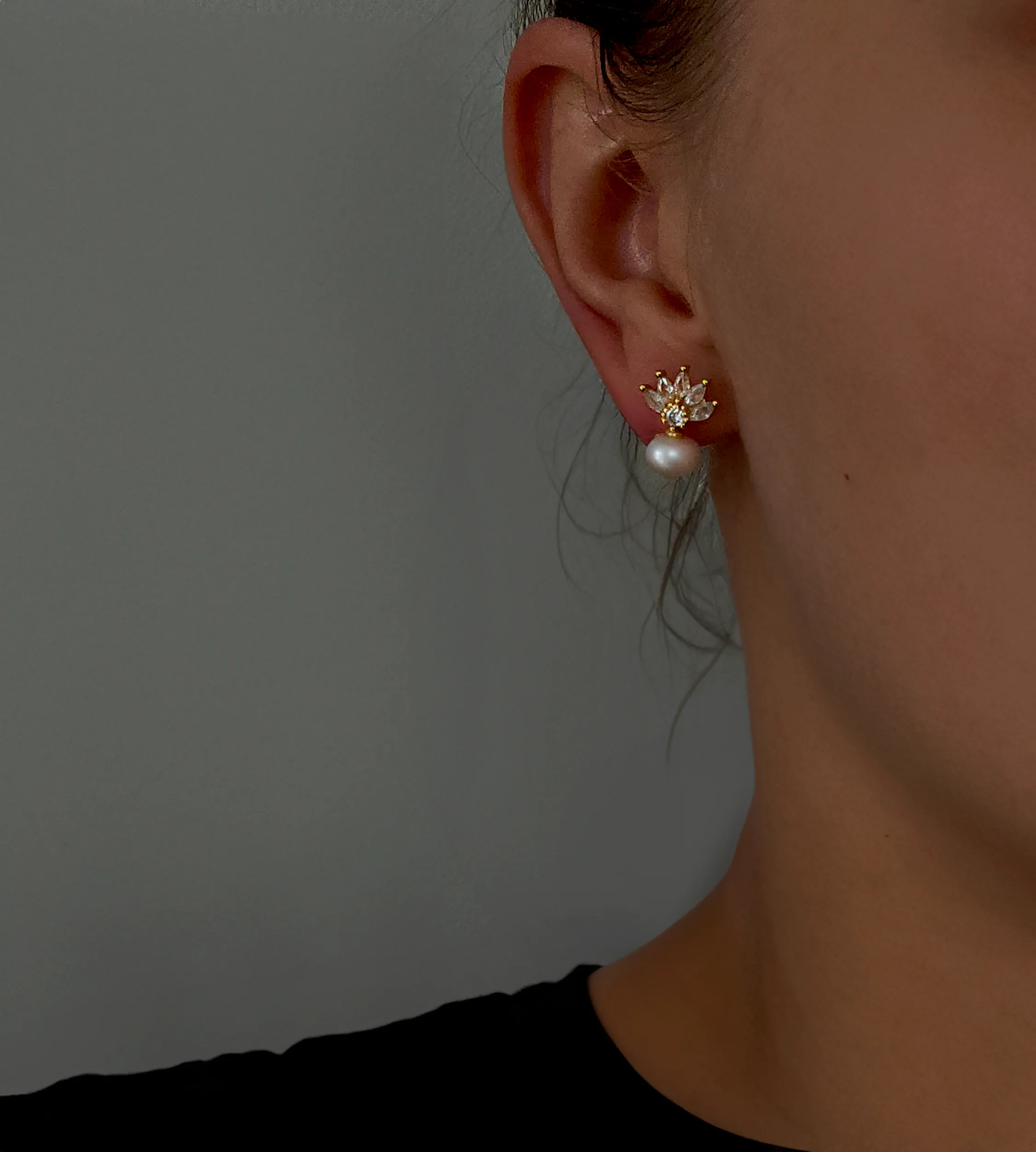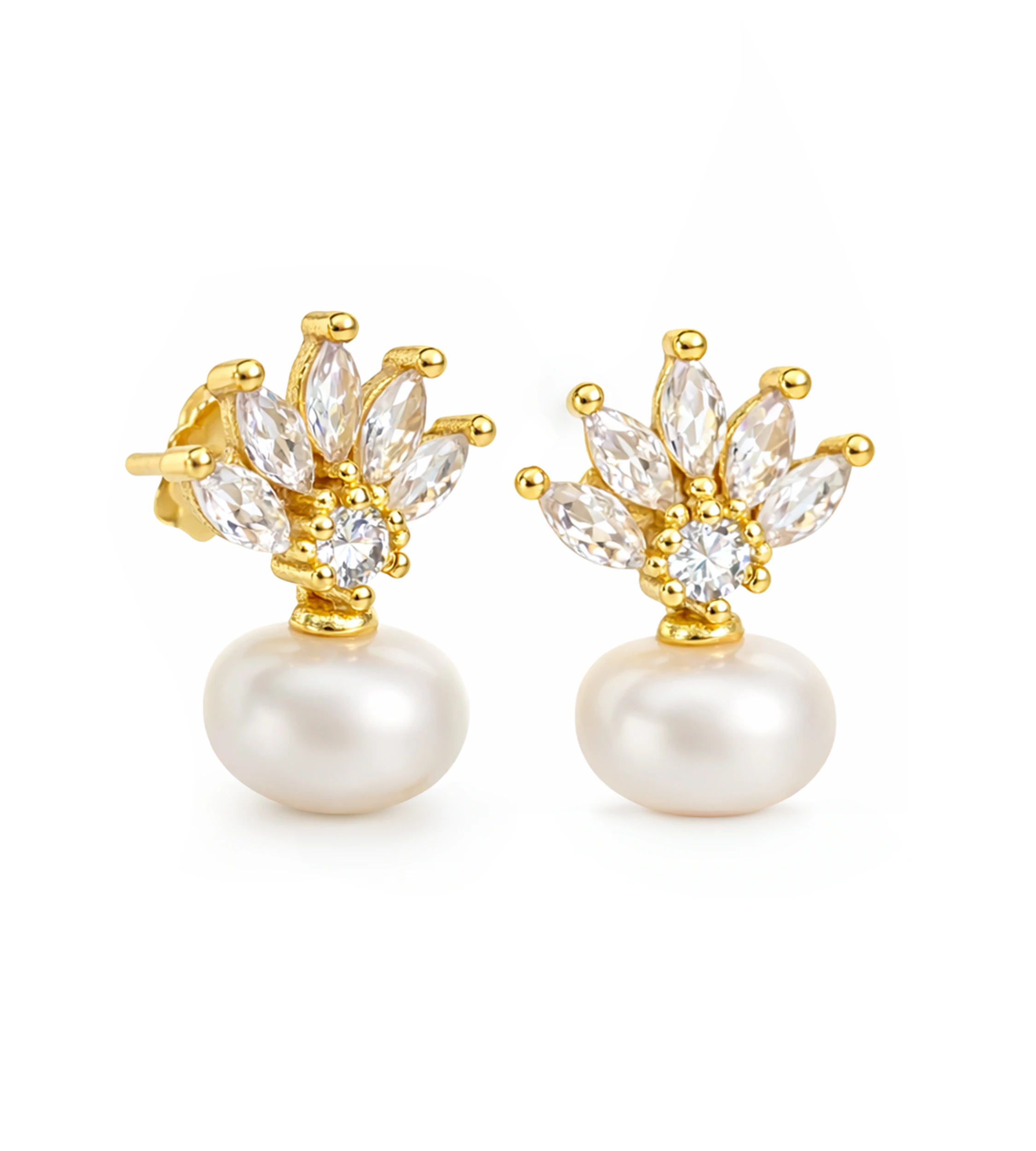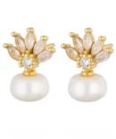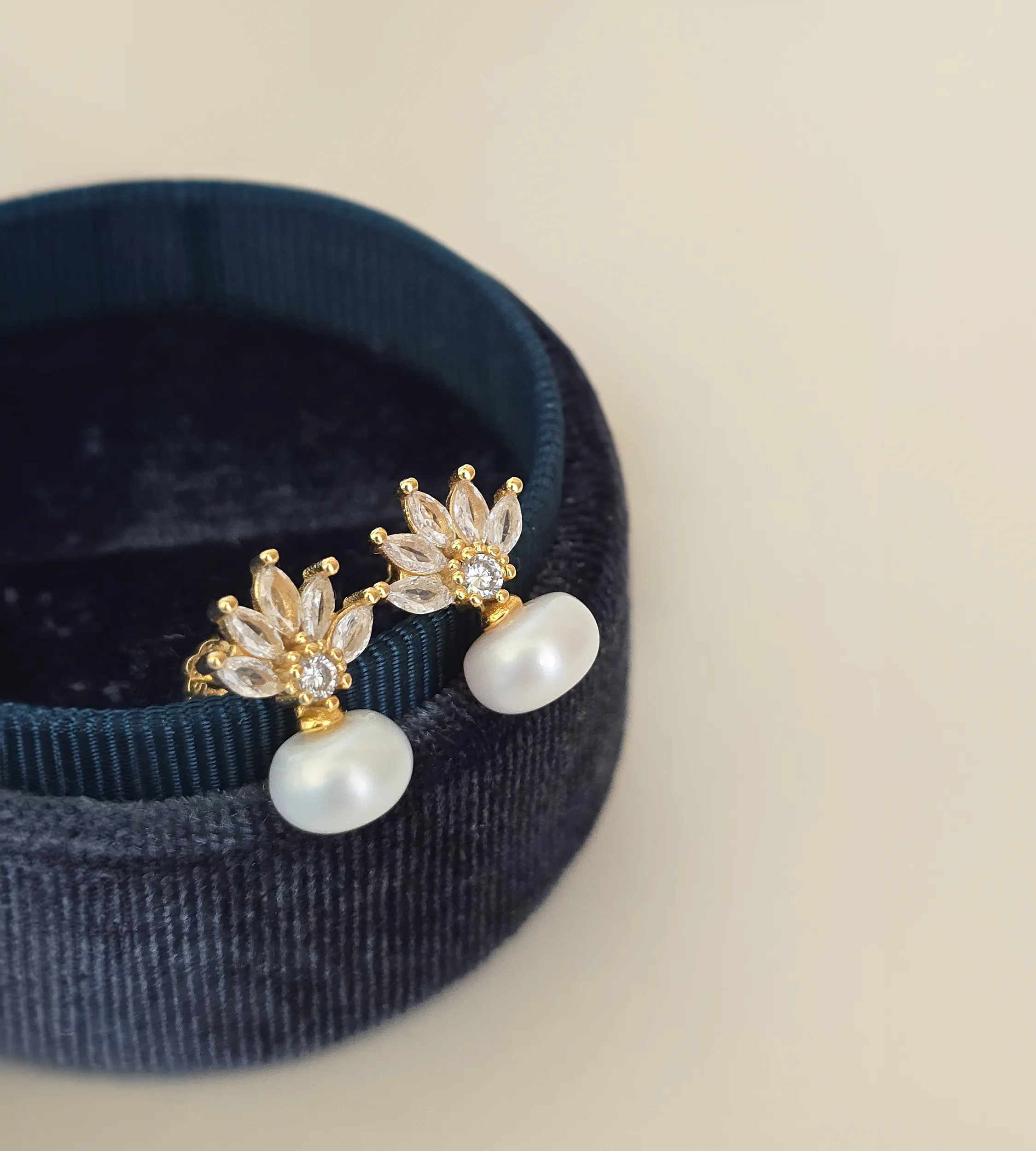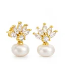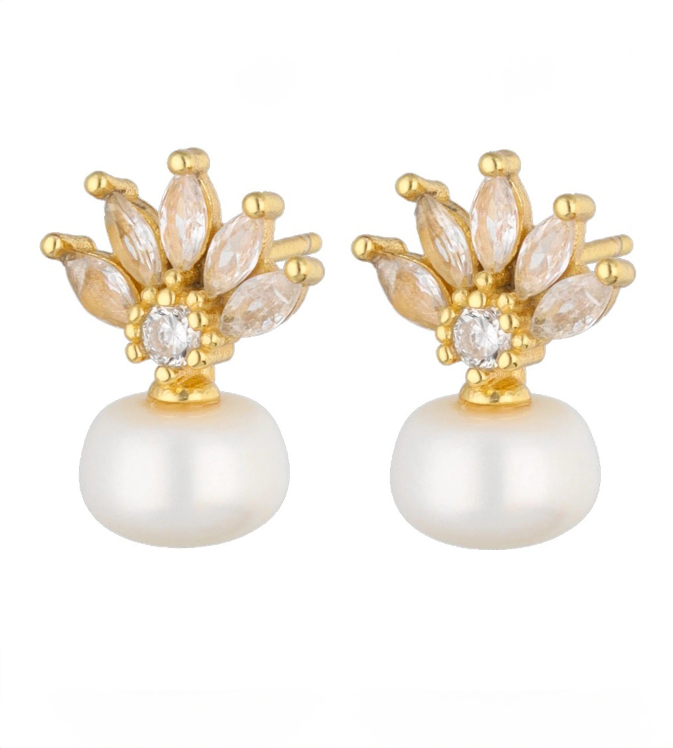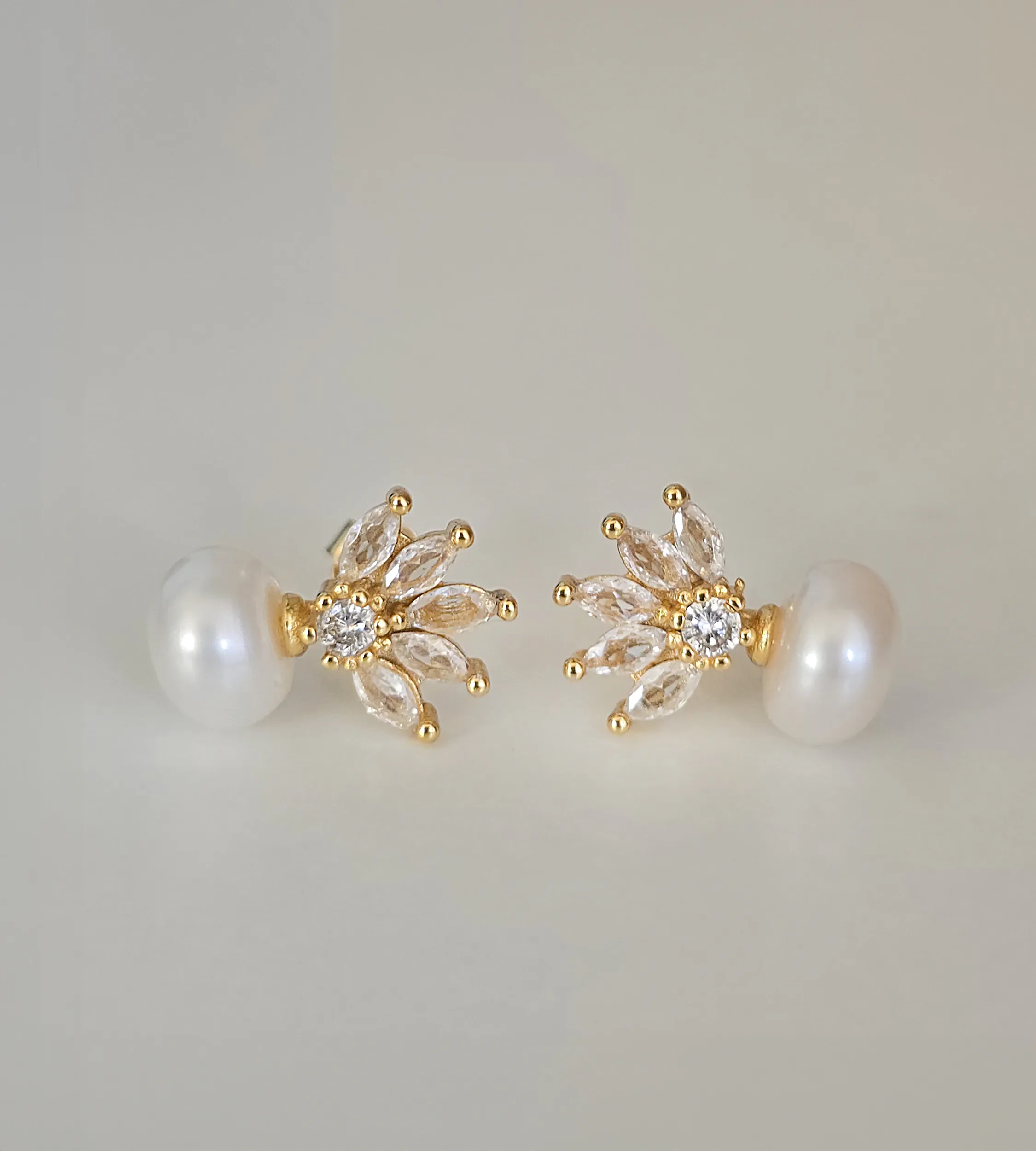 Pozłacane kolczyki w formie sztyftów, które z wdziękiem łączą urok perły z subtelną, dekoracyjną lekkością. Ich fantazyjna, niemal roślinna forma przywodzi na myśl tropikalny ananas lub kwitnący pąk, emanujący świeżością i kobiecością. Dolną część stanowi syntetyczna perła o lekko spłaszczonym, organicznym kształcie, która pięknie odbija światło i nadaje biżuterii delikatny, satynowy blask. Górna część to kompozycja z oszlifowanych cyrkonii, które rozchodzą się promieniście niczym płatki lub listki, tworząc efekt lekkości i dynamiki.