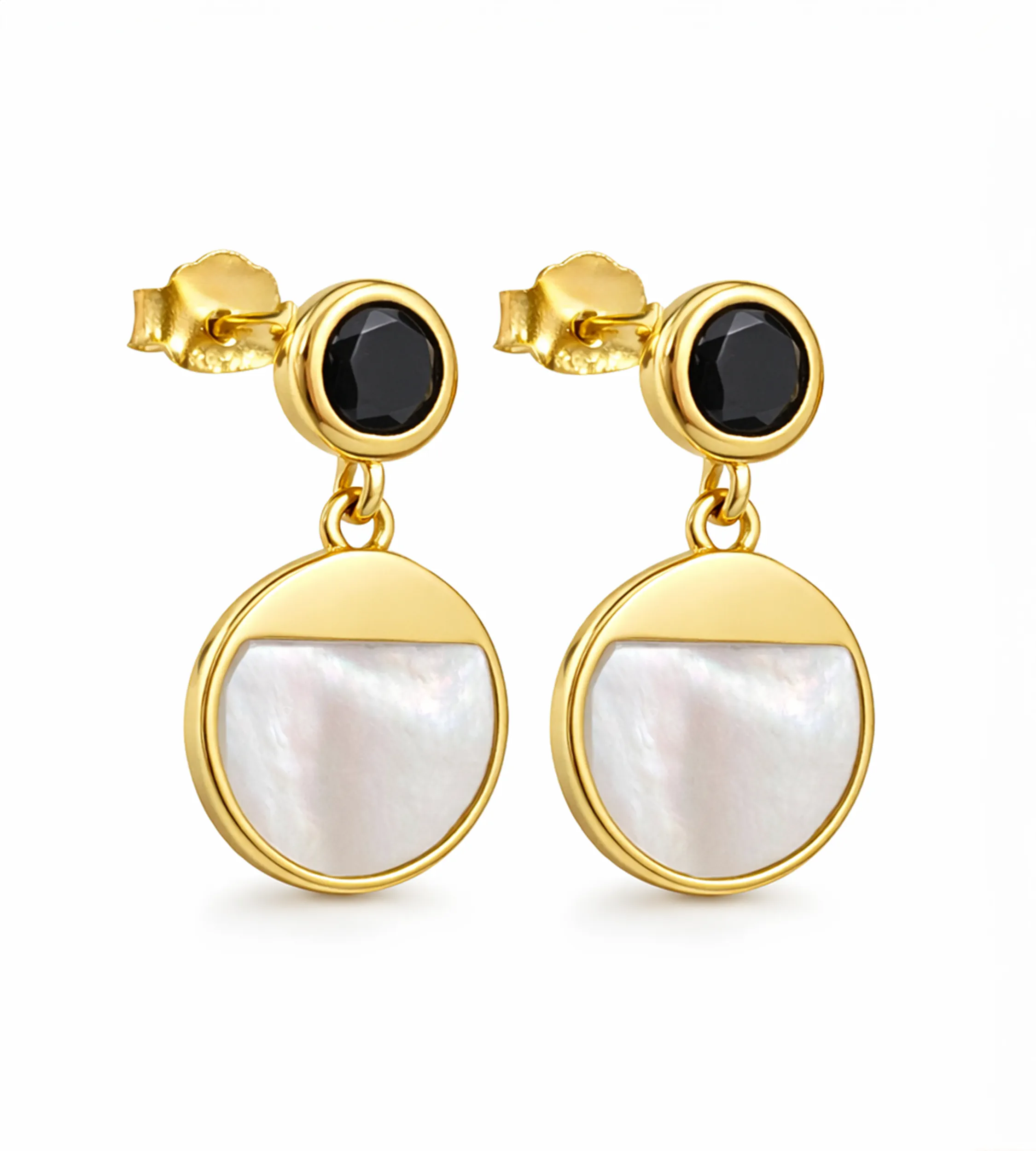 Złocone kolczyki z masą perłową i czarnym oczkiem. Geometryczna elegancja, kontrast i subtelność – idealne do stylizacji codziennych i eleganckich.