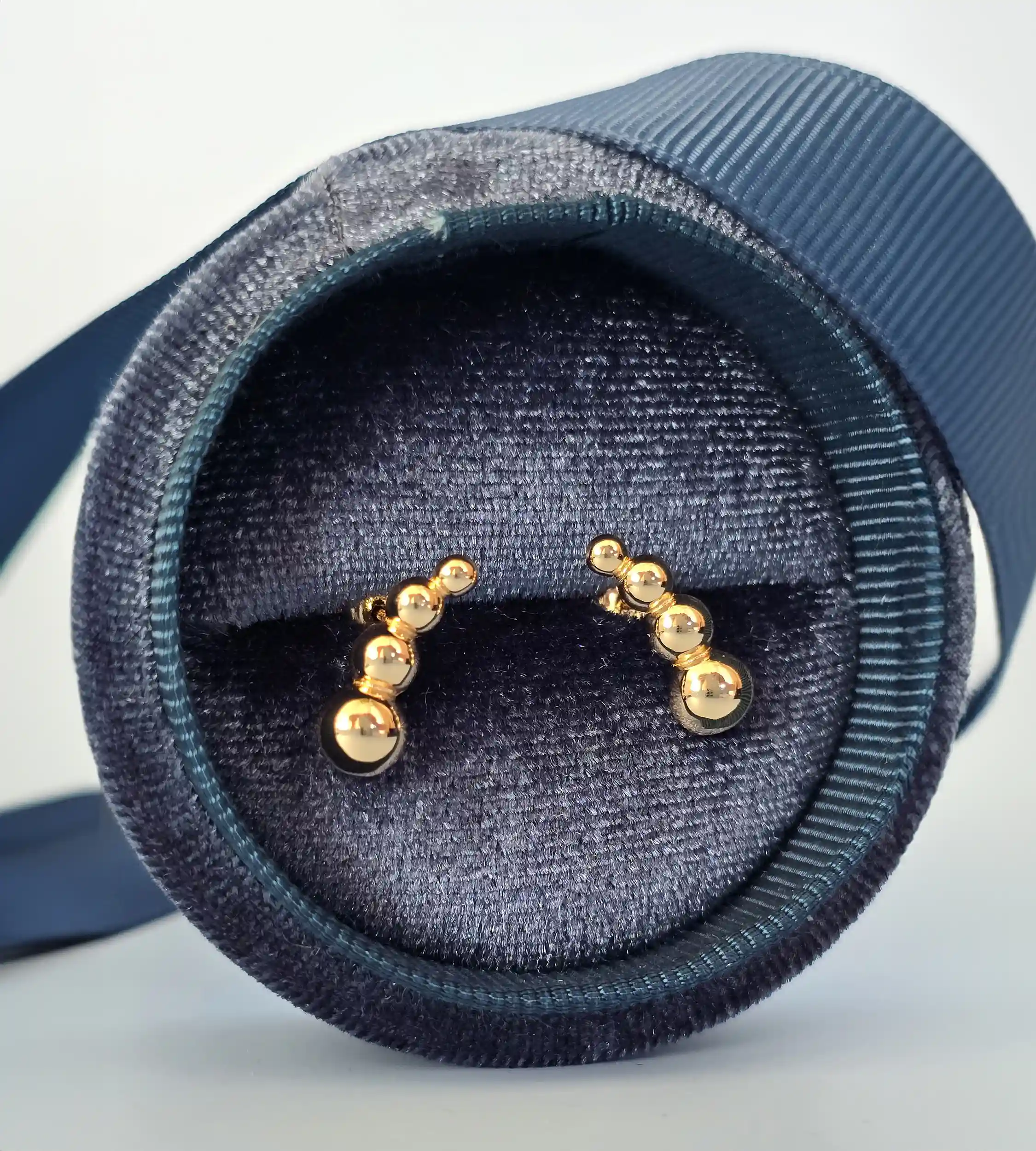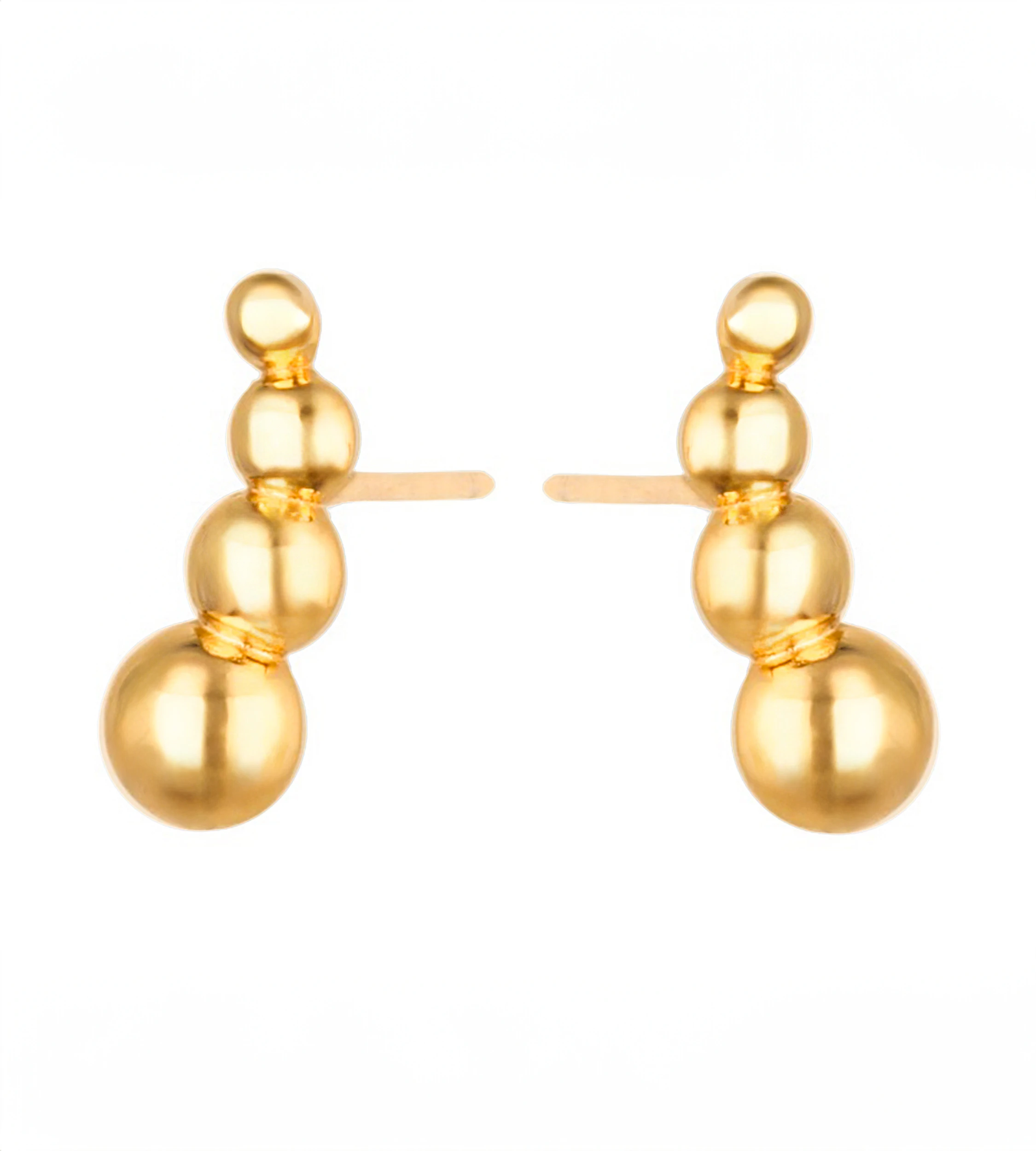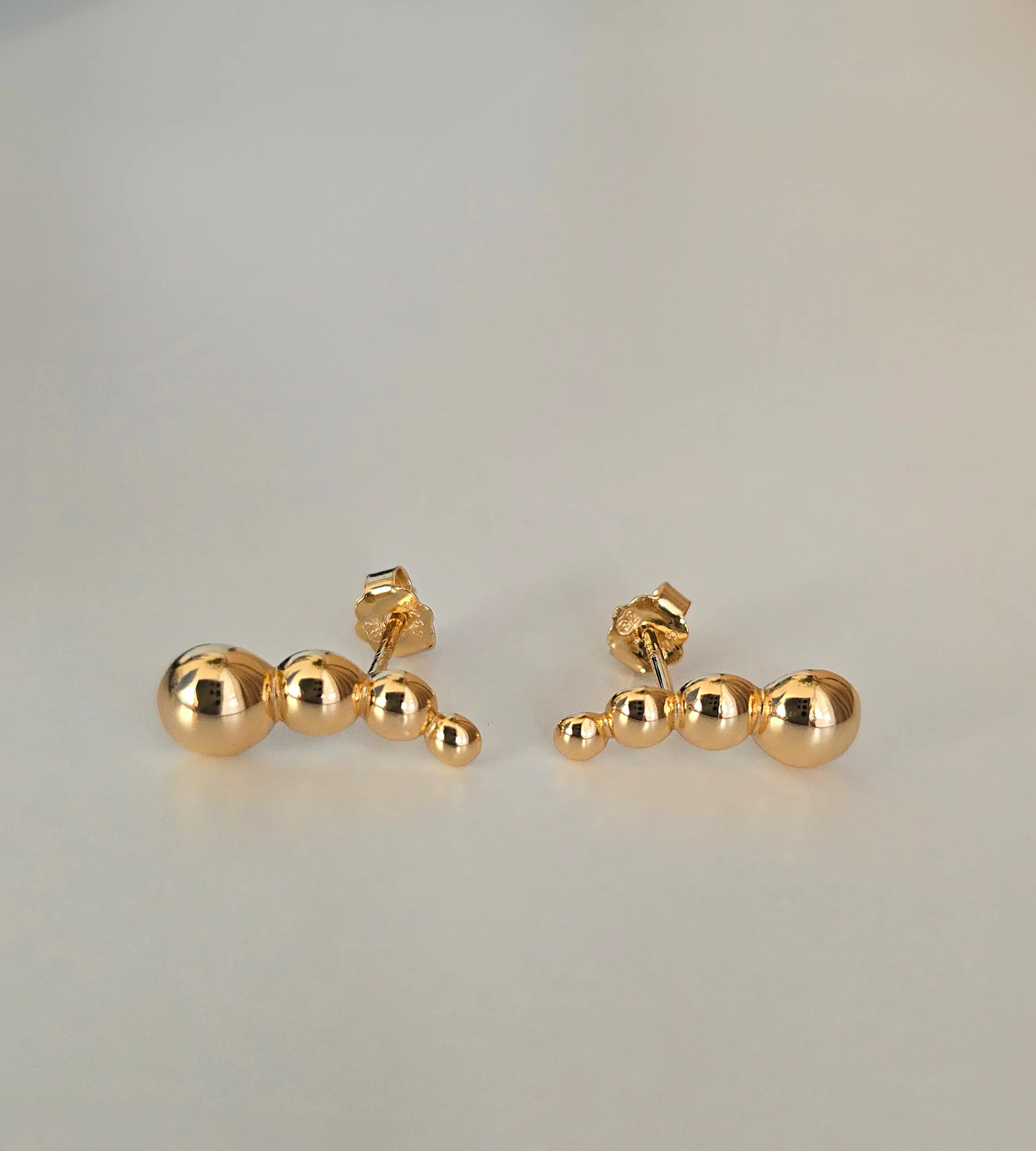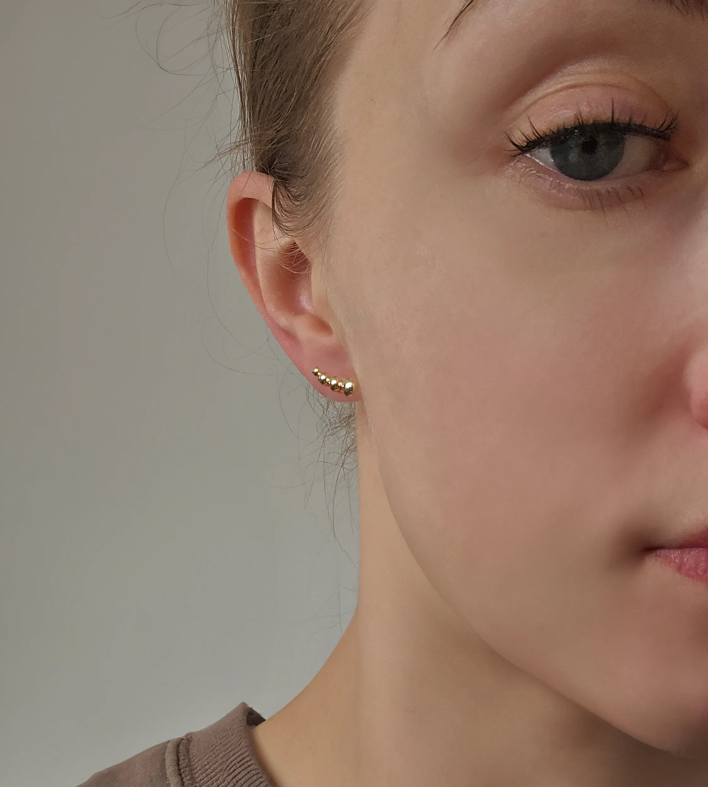 Kolczyki tworzą cztery połączone kuleczki, ułożone w lekki łuk – od największej (o średnicy 4 mm) do najmniejszej. Całość ma długość około 16 mm, co pozwala im pięknie dopasować się do linii płatka ucha. Ich design został zaprojektowany tak, by sztyft układał się poziomo wzdłuż ucha, podkreślając jego naturalny kształt.