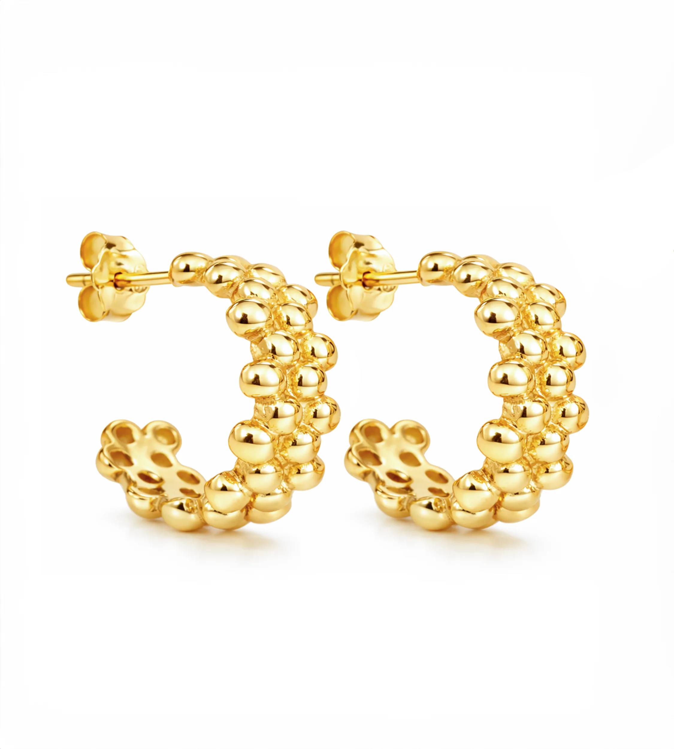 Półkoliste kolczyki na sztyft, złocone i delikatnie kulkowane. Subtelna forma z fakturą – dla kobiet kochających detale i nowoczesną elegancję.
