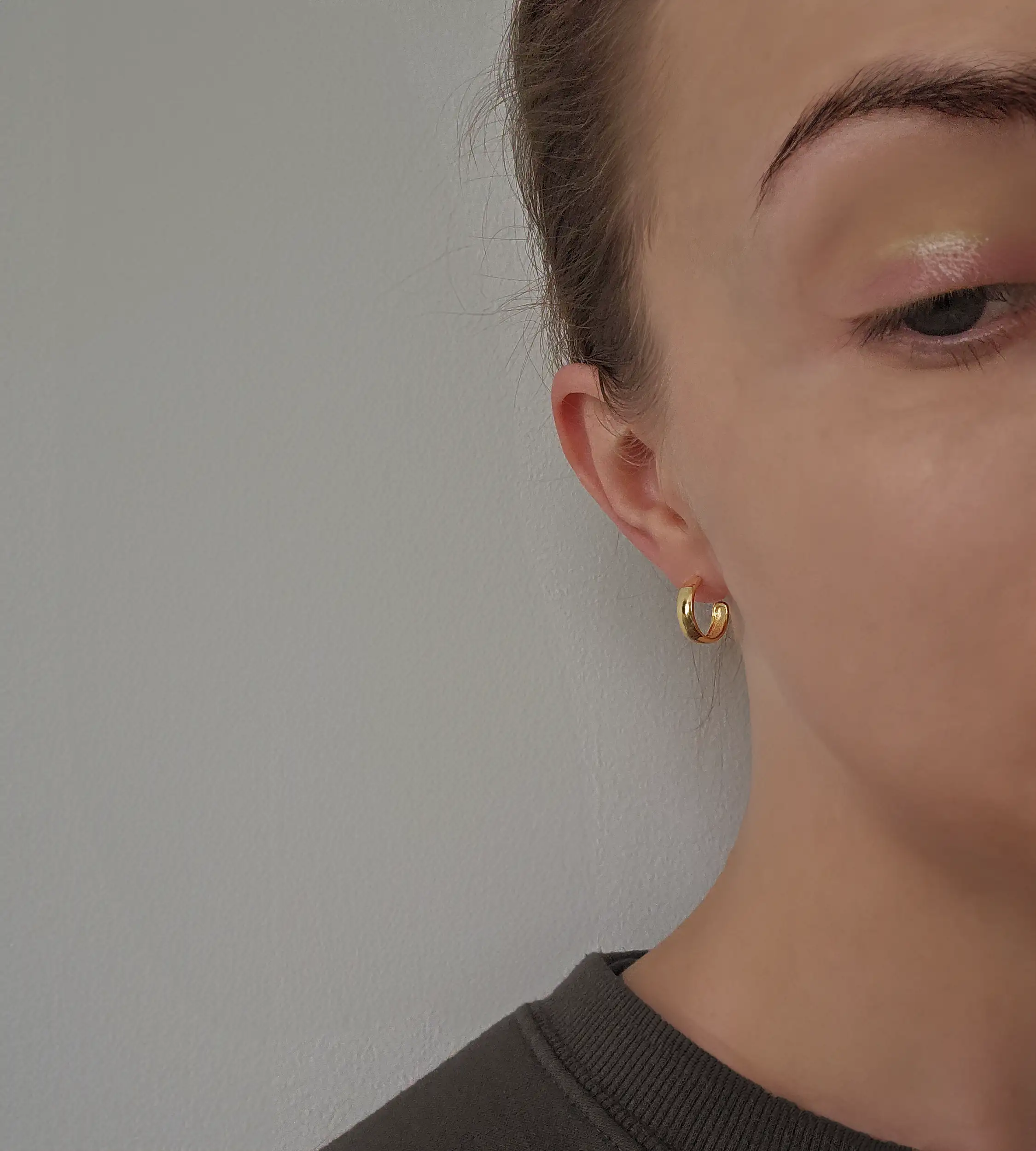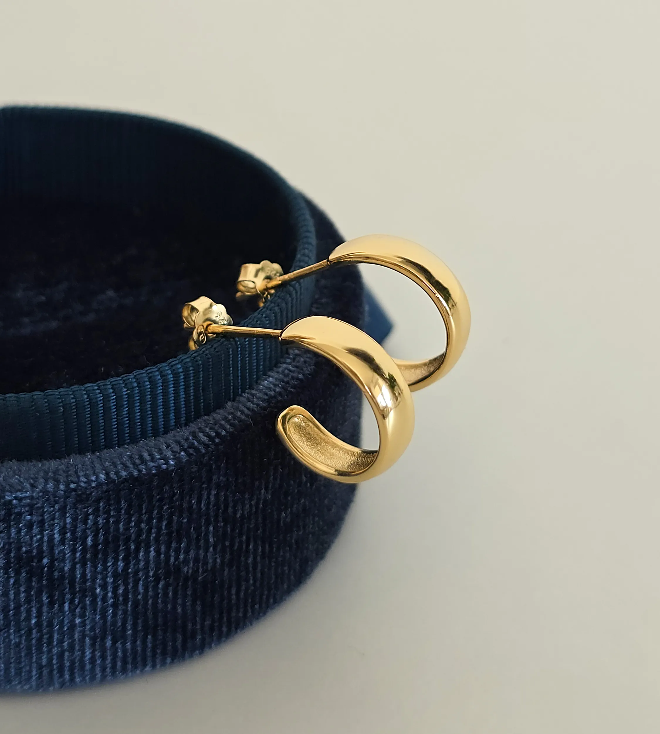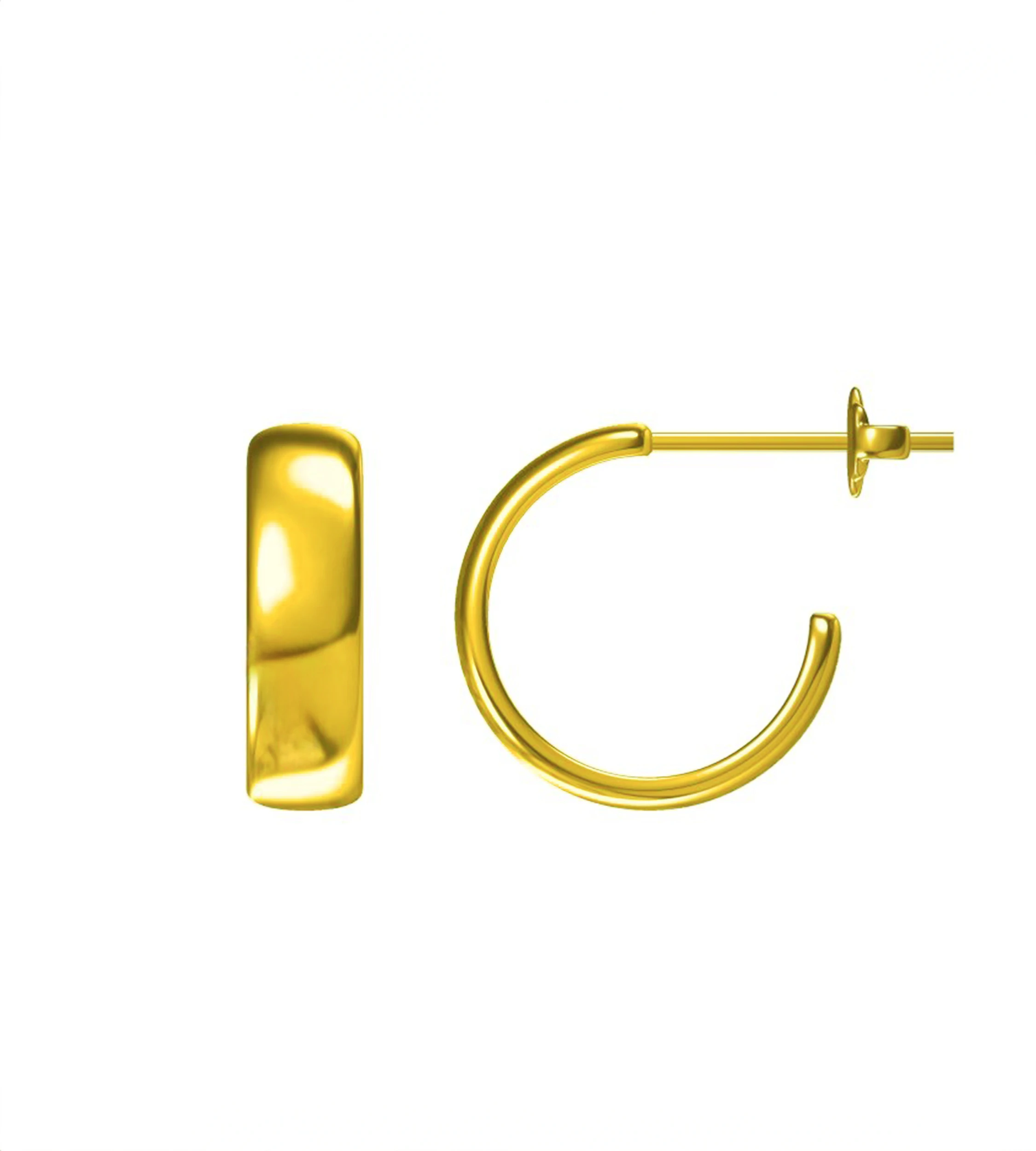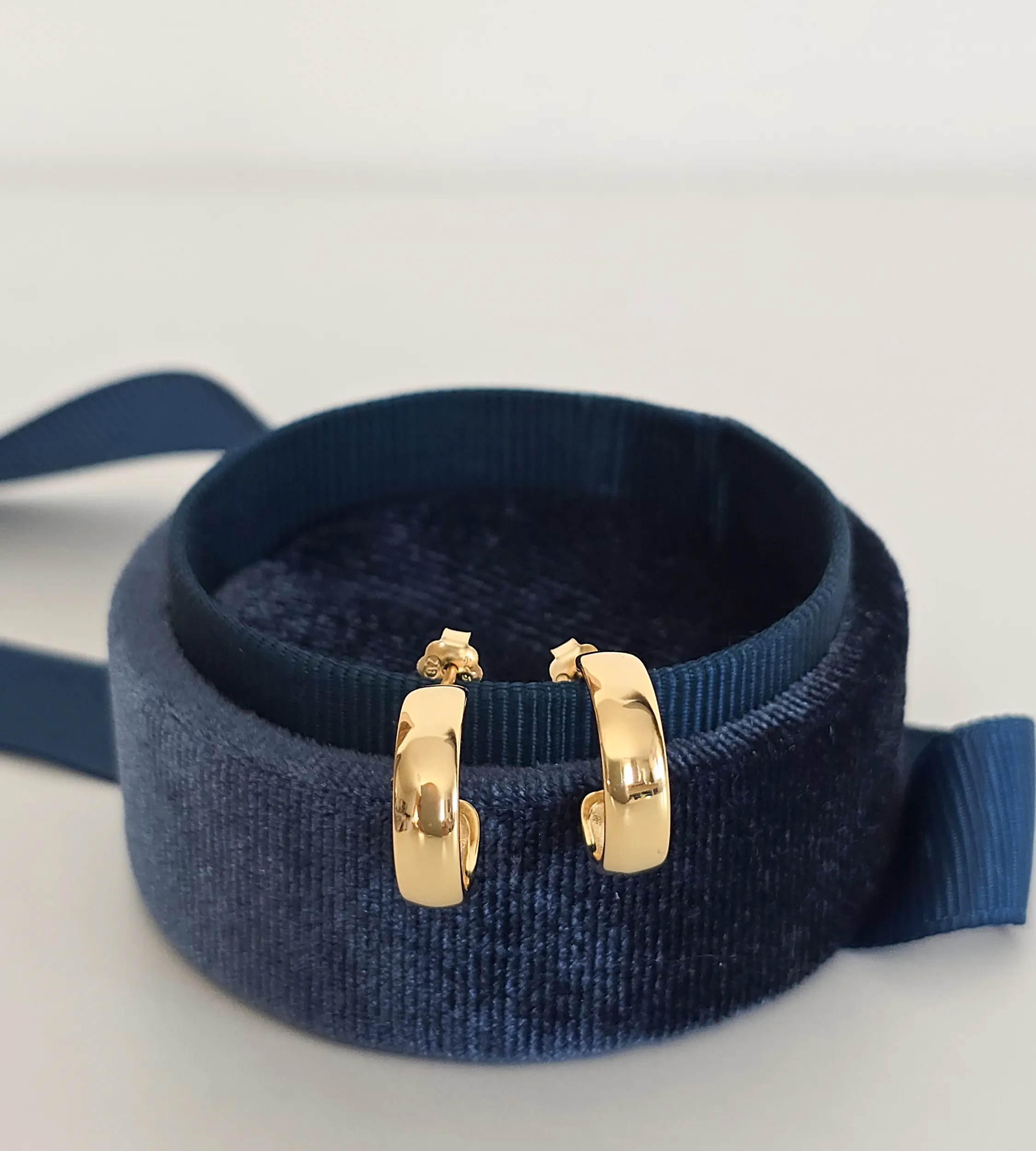 Złocone półkola, które balansują pomiędzy klasyką a nowoczesnością. Wykonane ze srebra próby 925 i pokryte złotem, mają formę grubych, gładkich półkoli, które miękko oplatają płatek ucha. Ich kompaktowa forma – 14 mm długości i 4 mm szerokości – daje wyrazisty efekt, nie tracąc lekkości.