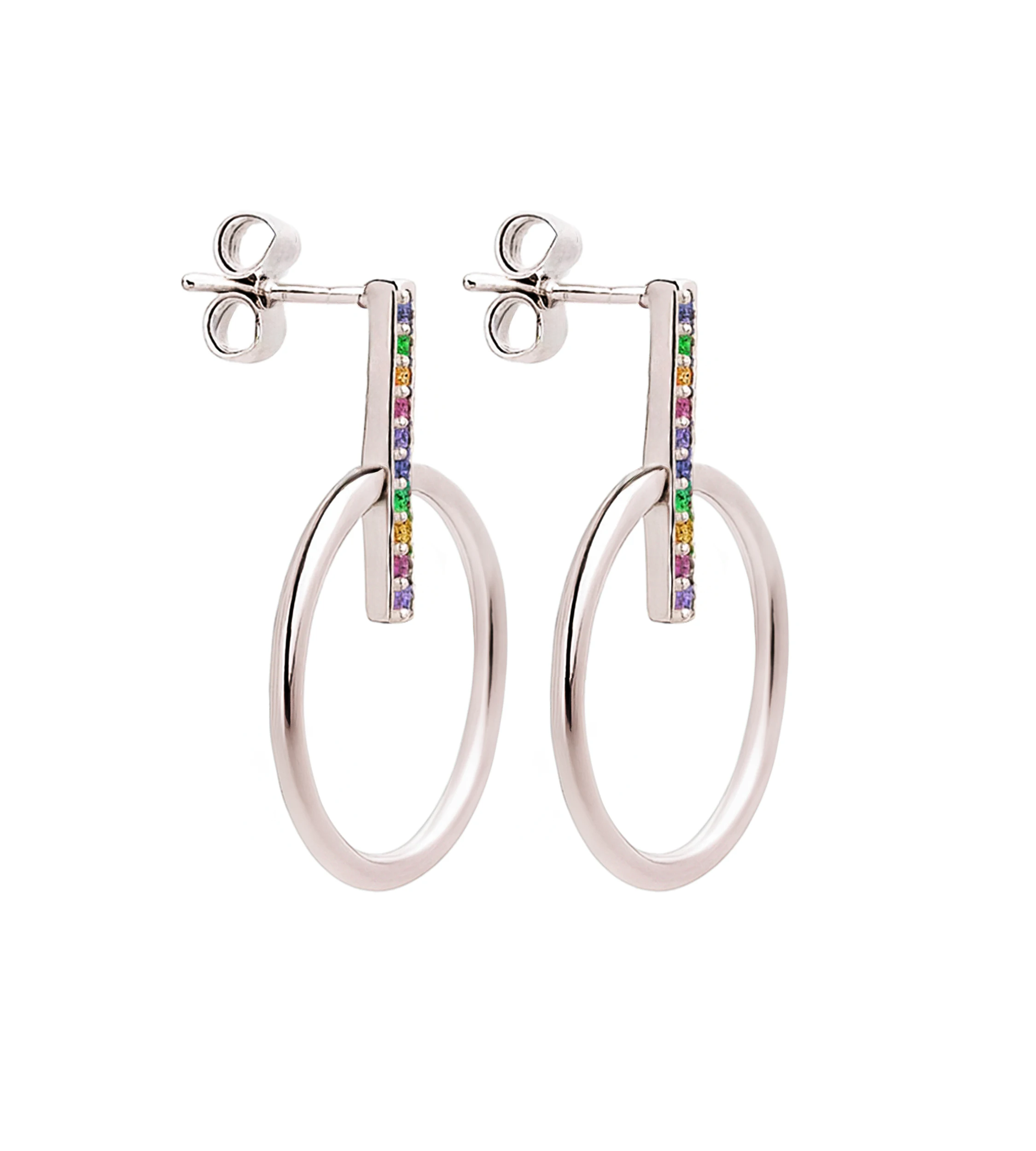 Proste srebrne kolczyki, które pasują do każdej kobiety i każdej codziennej lub eleganckiej stylizacji. Klasyczne kolczyki koła w minimalistycznej odsłonie to biżuteria, która nigdy nie wychodzi z mody. Model wykonany ze srebra próby 925, dodatkowo rodowany, dzięki czemu zyskuje piękny połysk i większą odporność na użytkowanie. Delikatne koło umieszczone zostało na krótkiej, subtelnej poprzeczce, a całość ozdobiona jest drobnymi, kolorowymi cyrkoniami, które dodają kolczykom lekkości i nowoczesnego charakteru.