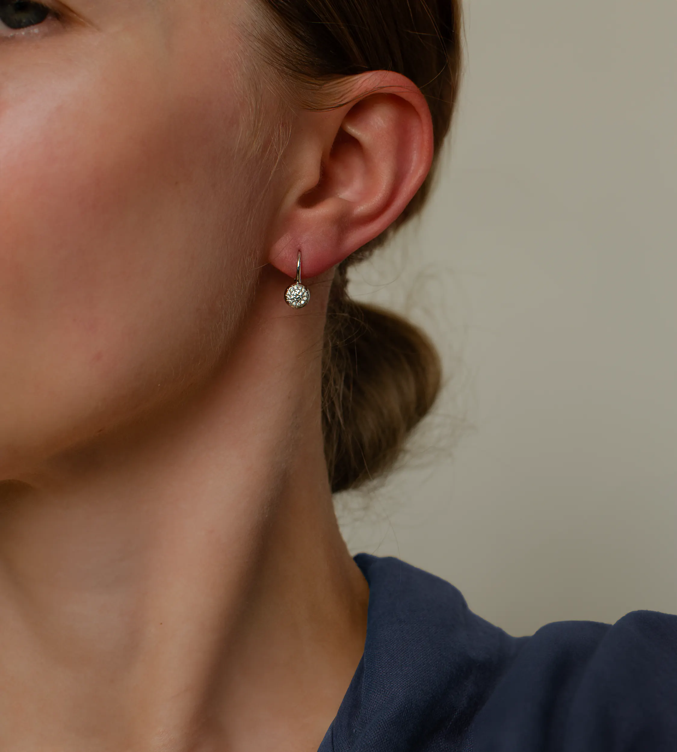 Długie kolczyki wykonane z białego złota 585 to połączenie subtelnej elegancji i ponadczasowego blasku. Na końcu prostej, smukłej linii umieszczona została rozeta wysadzana cyrkoniami — z centralnym większym kamieniem otoczonym drobnymi, misternie osadzonymi kamieniami tworzącymi świetlisty wianuszek. Całość pięknie odbija światło, przyciągając wzrok w delikatny, niewymuszony sposób.