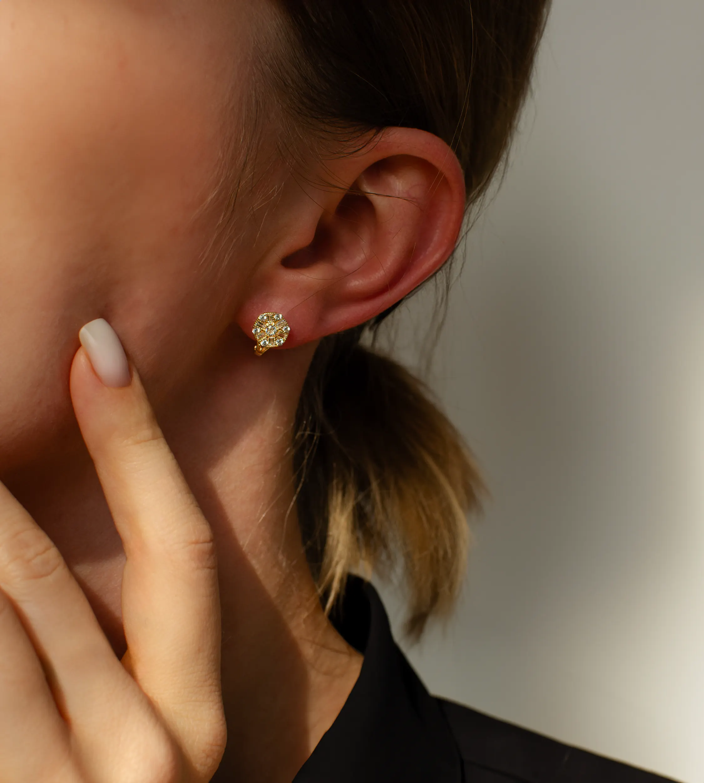 Złote kolczyki próby 585 z angielskim zapięciem, cyrkonie w kształcie słońca lub kwiatu. Eleganckie i uniwersalne, idealne na co dzień, wieczór i na prezent.