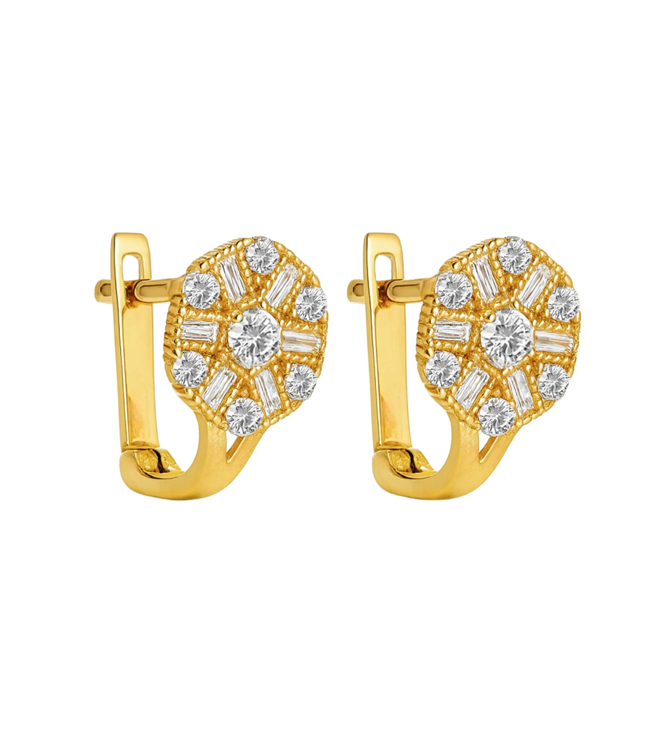 Złote kolczyki próby 585 z zapięciem typu angielskiego to elegancka i ponadczasowa biżuteria, która idealnie łączy klasykę z nowoczesnym minimalizmem. Ich wyjątkowy wzór w kształcie rozety, przypominający słońce lub delikatny kwiat, nadaje im subtelny i kobiecy charakter. Koło ozdobione cyrkoniami ma średnicę 7,8 mm, co sprawia, że kolczyki są niewielkie, ale bardzo efektowne. Dzięki dużej ilości drobnych oczek cyrkonie pięknie odbijają światło, nadając blasku każdej stylizacji.