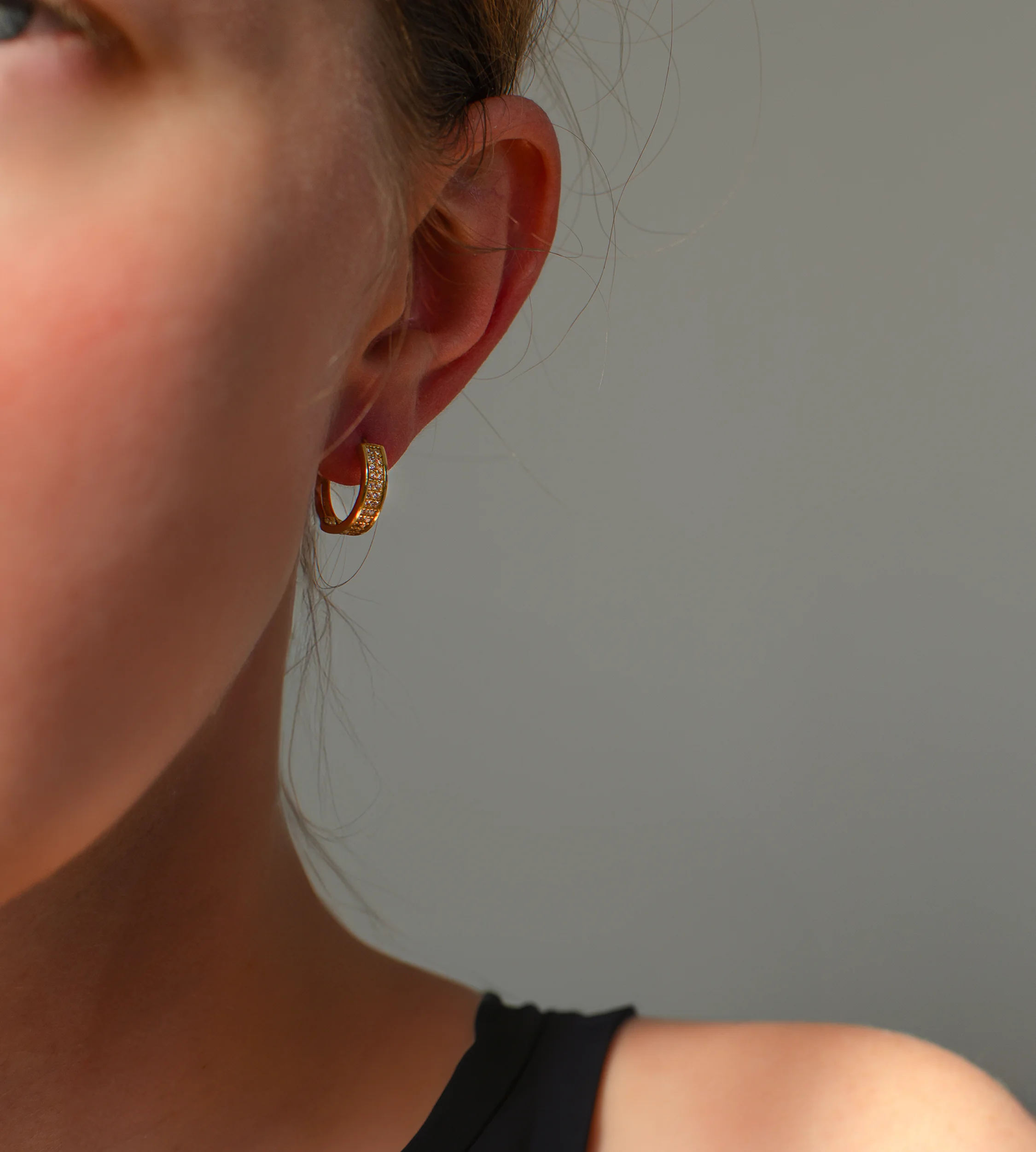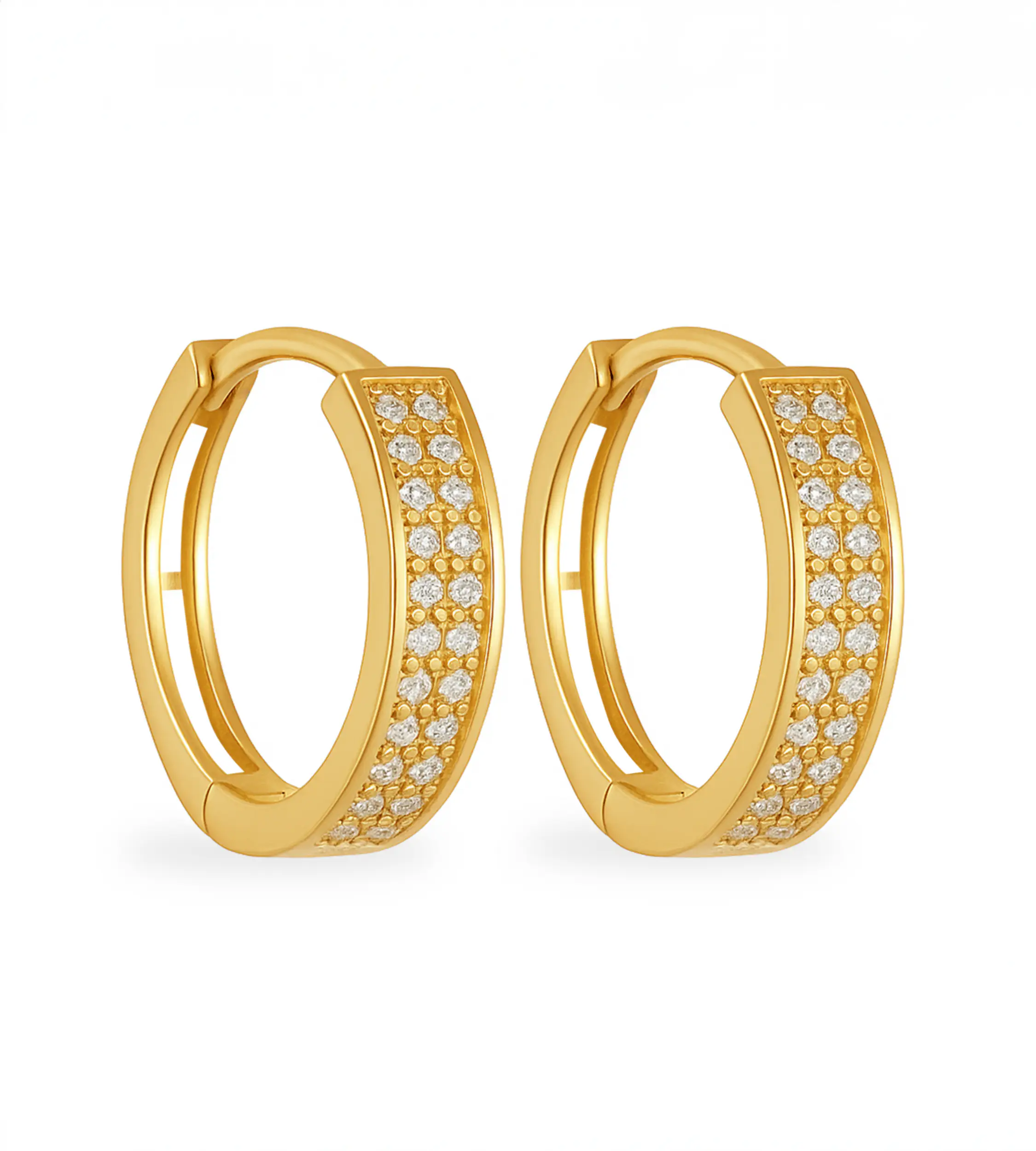 Złote kolczyki w kształcie kółka z cyrkoniami z przodu.