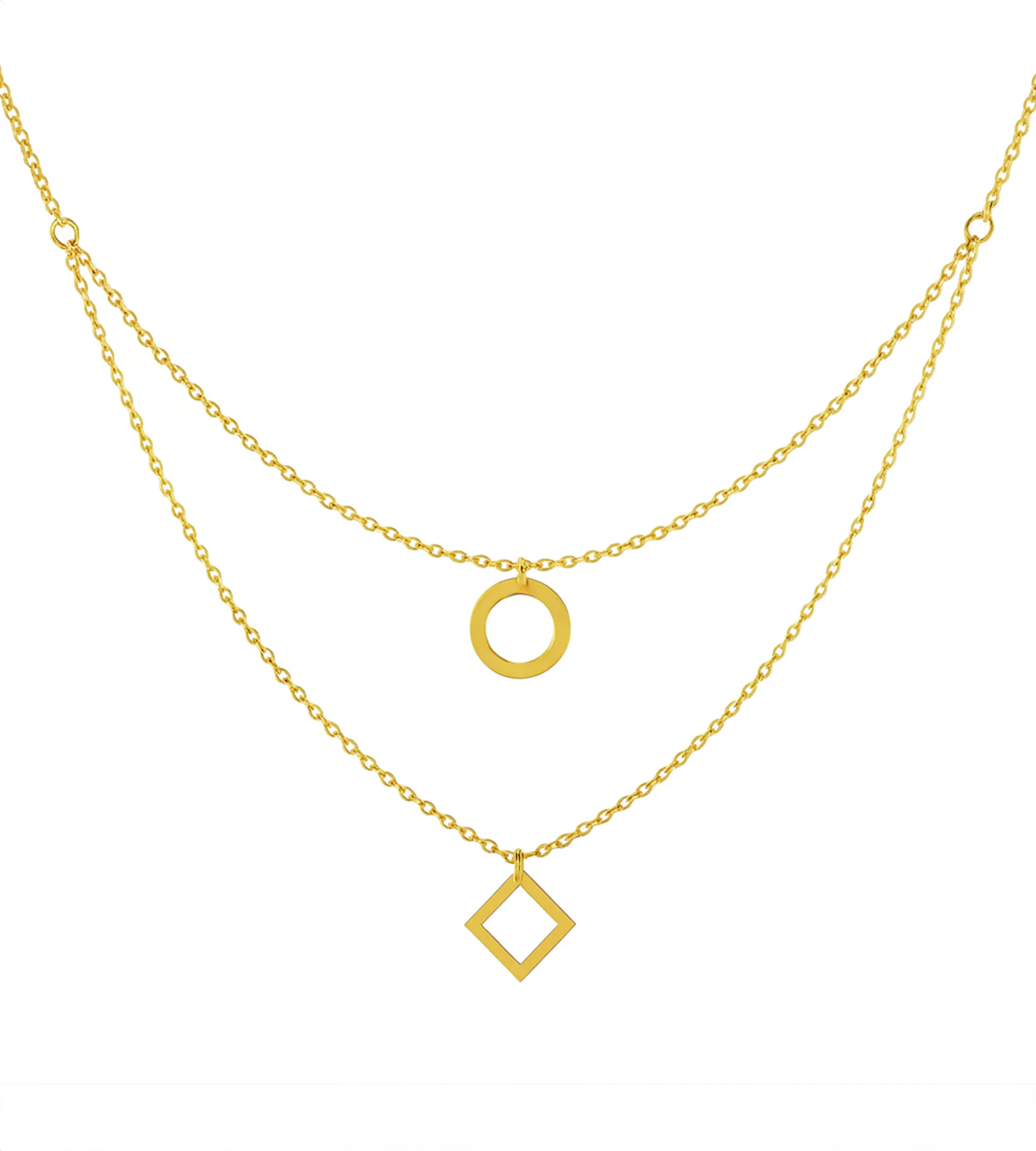 Złota celebrytka Akebia – naszyjnik z kołem i kwadratem na delikatnym łańcuszku. Idealny dodatek do codziennych i eleganckich stylizacji.