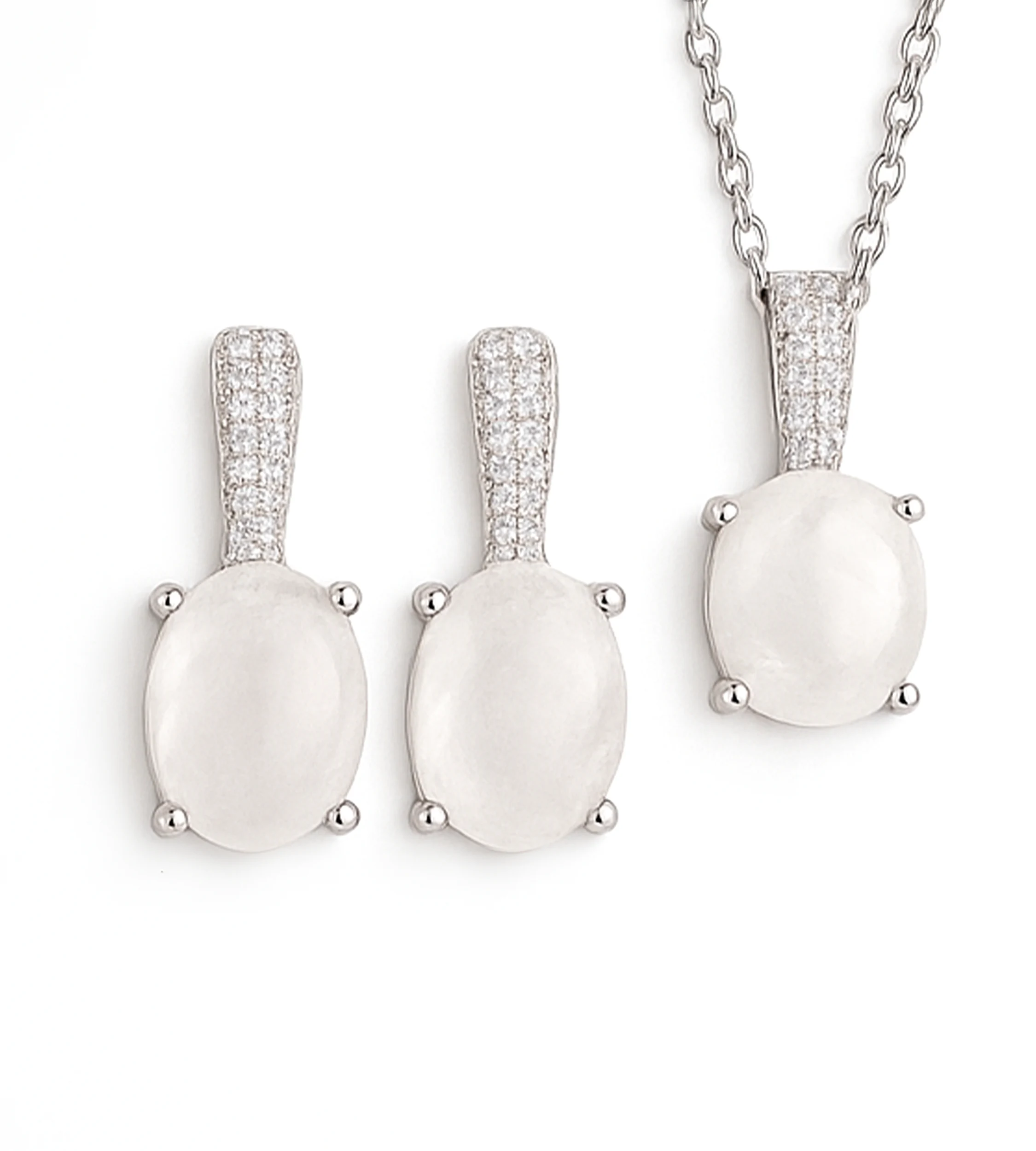 Srebrny komplet biżuterii próby 925 zachwyca połączeniem klasycznej formy i nowoczesnej elegancji. Zarówno kolczyki, jak i zawieszka mają piękny, owalny kształt wypełniony masą perłową, która subtelnie odbija światło, tworząc efekt miękkiego, perłowego blasku. W górnej części kolczyków umieszczono drobne białe cyrkonie, dodające całości wyjątkowego rozświetlenia. Biżuteria została dodatkowo rodowana, dzięki czemu zyskuje szlachetną barwę i wyższą odporność na matowienie.