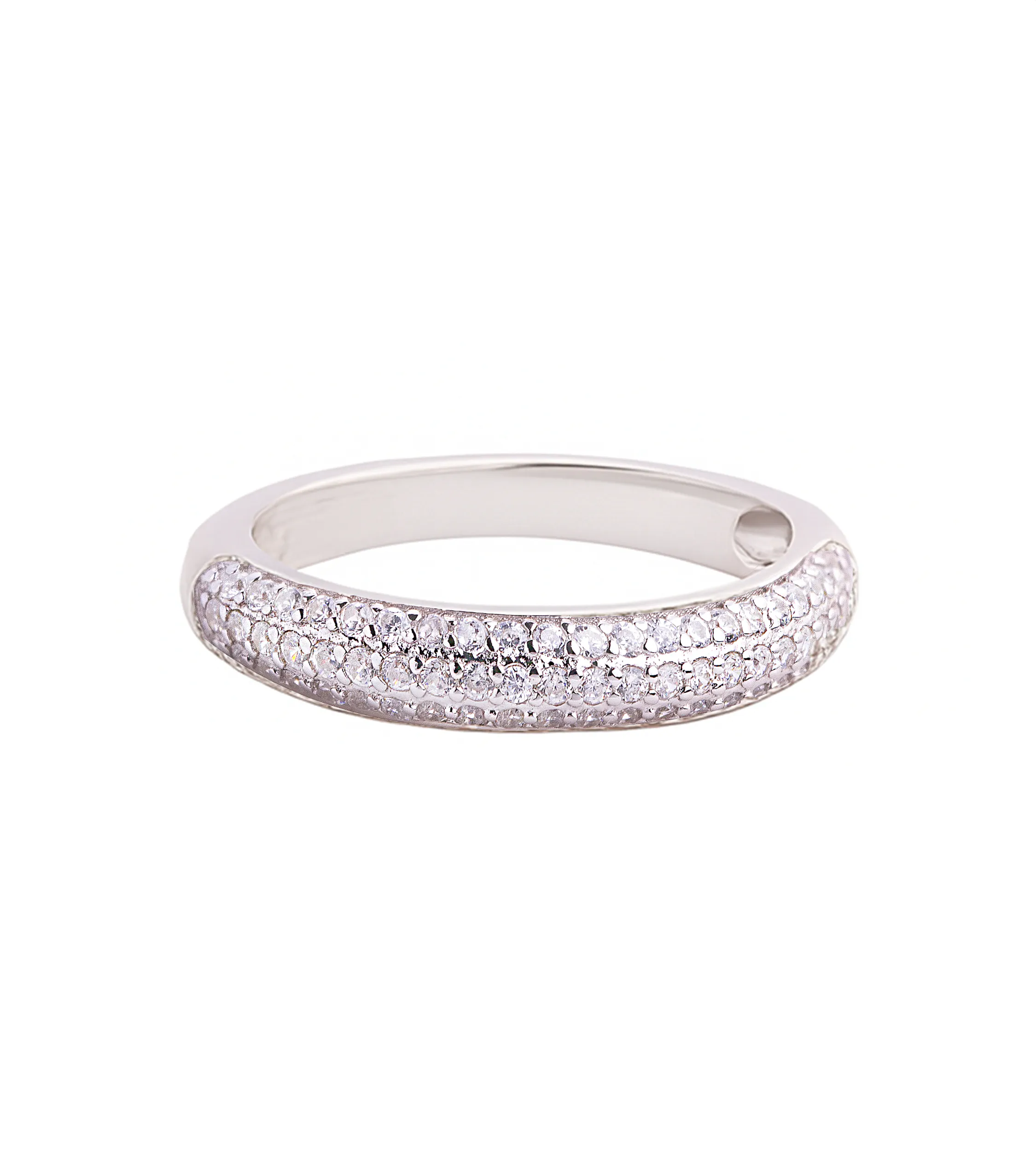 Srebrny pierścionek damski wykonany z wysokiej jakości srebra próby 925, rodowany dla większej trwałości i pięknego, chłodnego blasku. Przód pierścionka zdobią trzy rzędy białych cyrkonii, ułożonych w lekko wypukłą formę, która subtelnie odbija światło i dodaje biżuterii elegancji. Wykończenie na wysoki połysk podkreśla szlachetny charakter srebra, a szerokość 4 mm z przodu sprawia, że pierścionek prezentuje się efektownie, zachowując jednocześnie lekkość.
