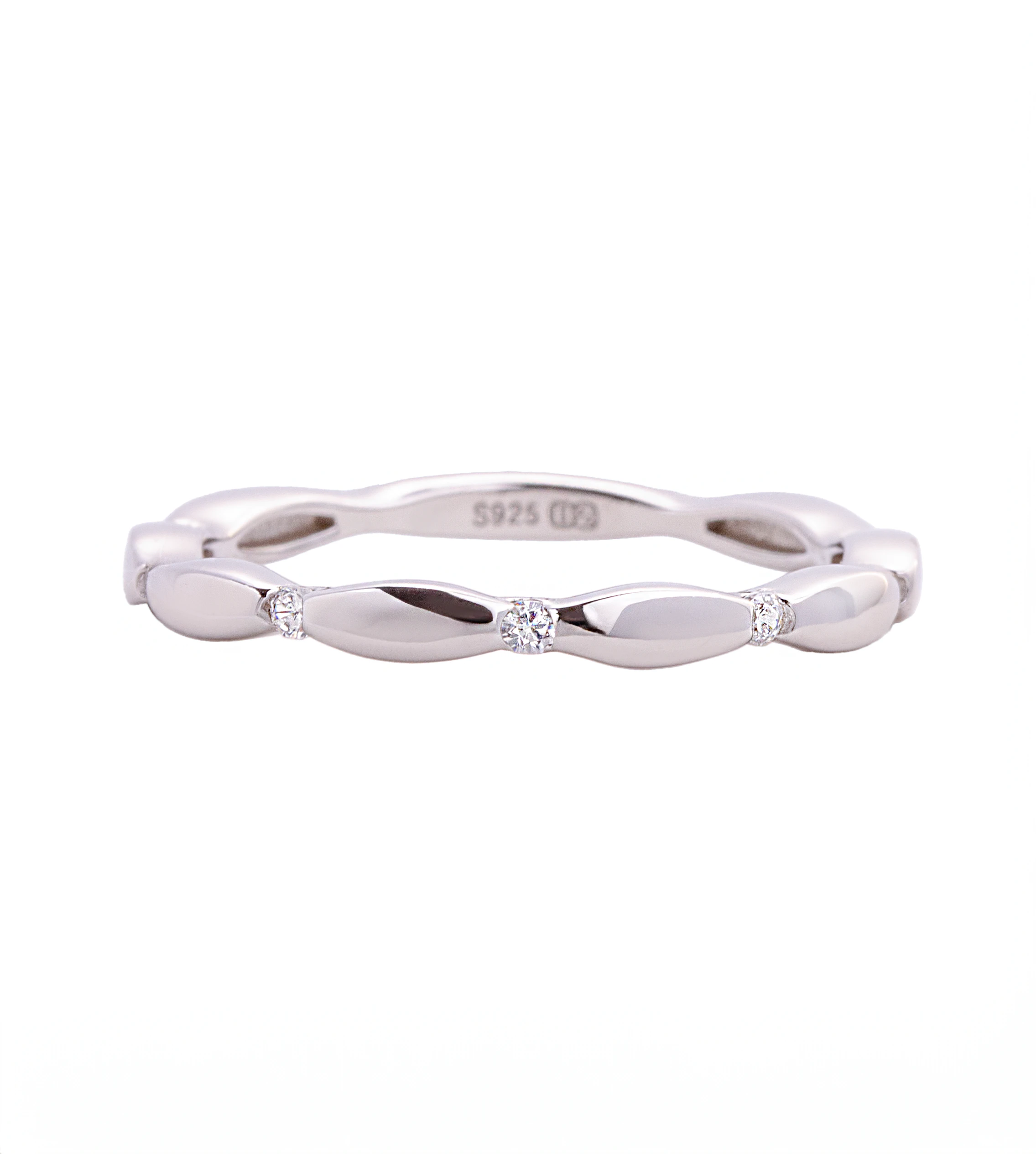 Srebrny pierścionek próby 925 to delikatna i ponadczasowa biżuteria, która zachwyca subtelnym blaskiem i klasyczną formą. Na przodzie obrączki znajdują się małe, błyszczące oczka z białej cyrkonii, które pięknie odbijają światło i dodają całości eleganckiego wykończenia. Pierścionek wykonany jest ze srebra rodowanego, dzięki czemu utrzymuje wysoki połysk, jest bardziej odporny na ciemnienie, a jego powierzchnia długo pozostaje perfekcyjnie gładka. Szerokość obrączki to 2,3 mm, co czyni ją wyjątkowo subtelną i wygodną w codziennym noszeniu.