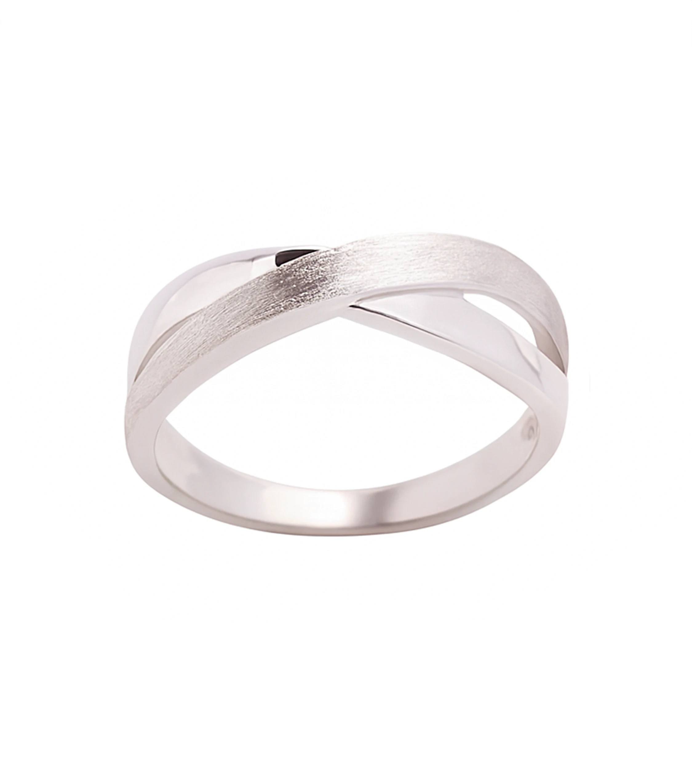 Srebrny pierścionek damski wykonany z wysokiej jakości srebra próby 925, rodowany dla zwiększonej trwałości i odporności na ciemnienie. Jego forma opiera się na subtelnym splocie, w którym dwie powierzchnie spotykają się w eleganckim kontraście — jedna część wykończona na wysoki połysk, druga delikatnie satynowana. Dzięki temu pierścionek zachwyca prostotą i nowoczesnym charakterem. Szerokość w najszerszym miejscu wynosi 6 mm, co nadaje mu wyrazistości bez efektu ciężkości.