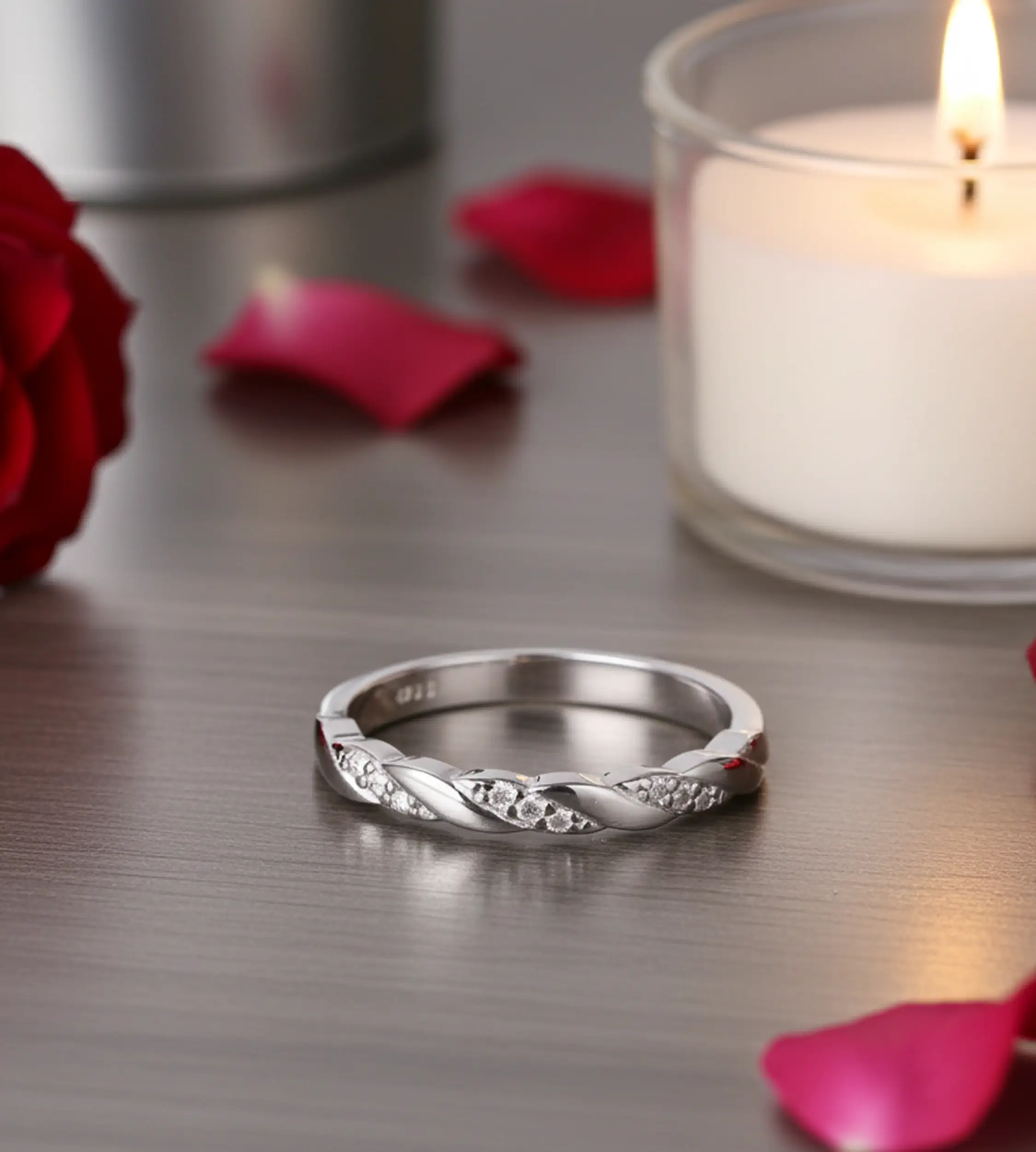Elegancki srebrny pierścionek próby 925, którego front zdobią delikatnie przeplatające się białe cyrkonie ze srebrem. Pierścionek ma szerokość 2 mm, dzięki czemu prezentuje się subtelnie i lekko na dłoni.