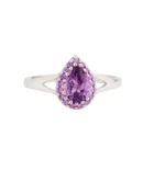 Luksusowy srebrny pierścionek próby 925 z ametystem w kształcie łezki i fioletowymi cyrkoniami. Efektowna, królewska biżuteria dla kobiet kochających kolor, blask i wyraziste formy. Idealny także jako pierścionek zaręczynowy.