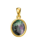 Zielony epidot oprawiony w gładką ramkę ze srebra pokrytego złotem przyciąga wzrok subtelną intensywnością i głębią koloru. Każdy kamień to unikat – odcienie zieleni mogą się przeplatać z czernią, różem, a nawet lekką fioletową poświatą, co nadaje zawieszce niepowtarzalny, organiczny charakter.
