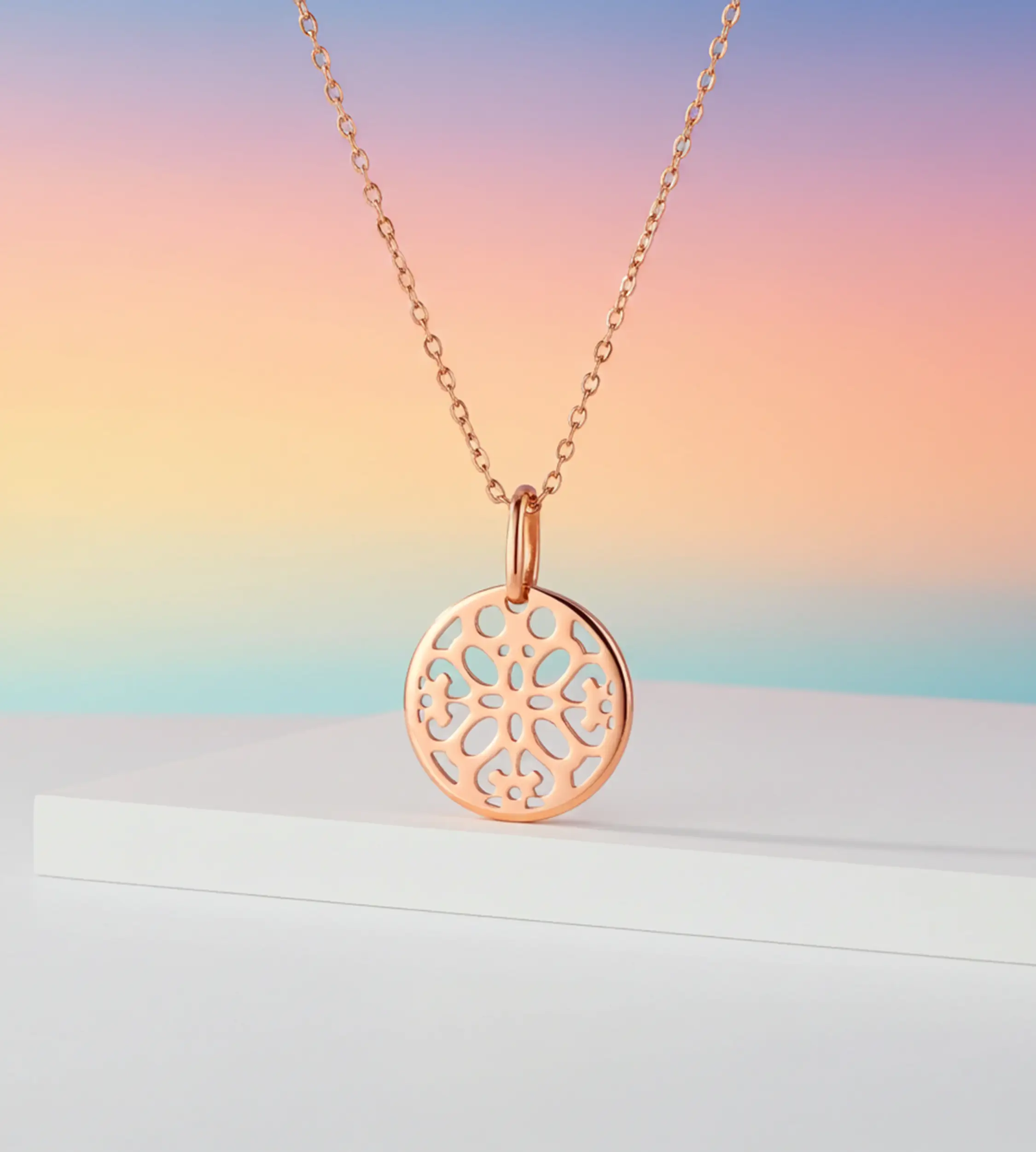 Zawieszka z różowego złota próby 585 w formie koła z misternym motywem mandali. Symbol harmonii i wewnętrznego spokoju – subtelna biżuteria z przesłaniem.