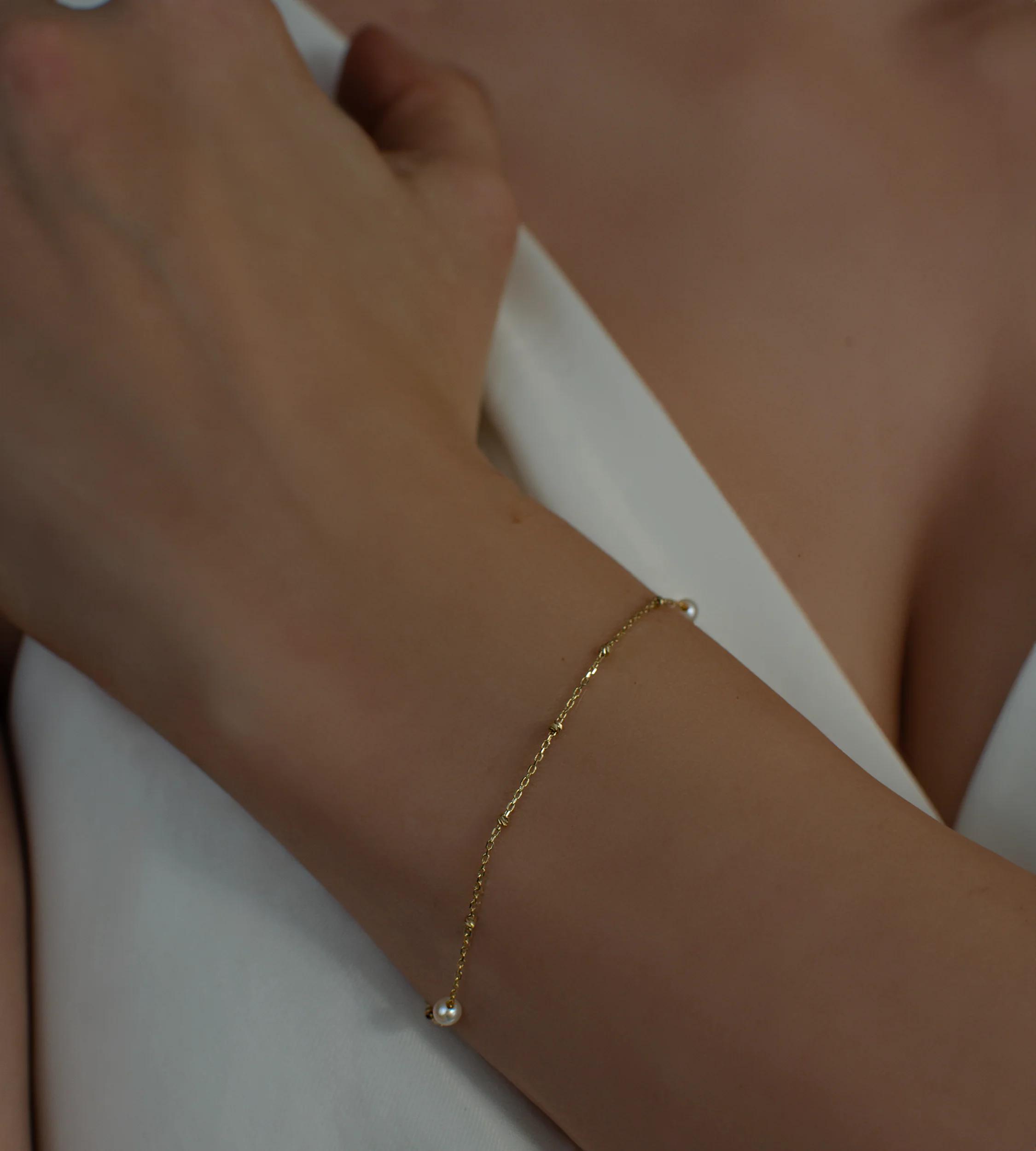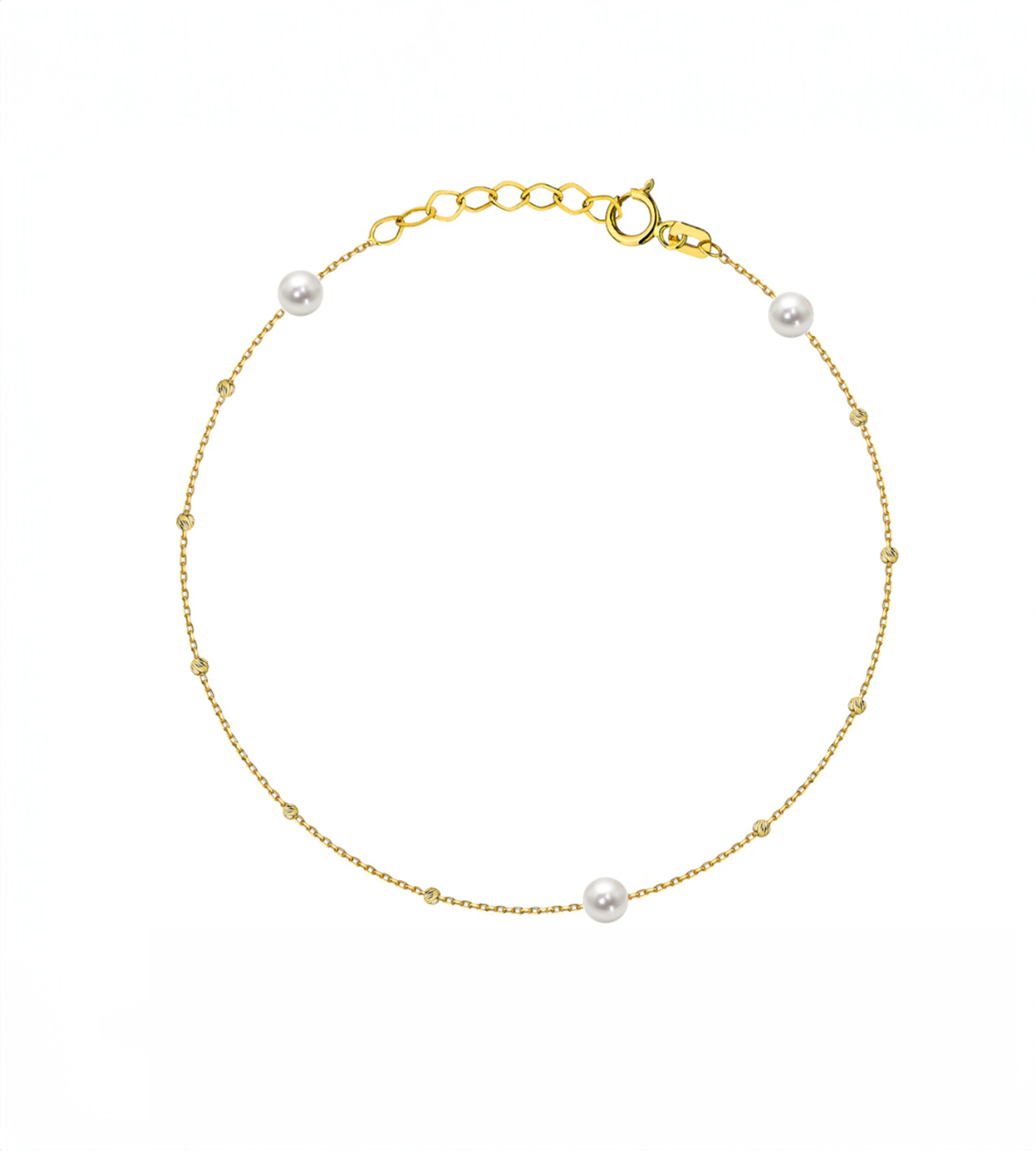 Bransoletka oparta jest na splocie ankier, który zapewnia lekkość i trwałość. Jej główną ozdobą są trzy naturalne perły słodkowodne o średnicy ok. 3,4 mm, przeplecione wieloma drobnymi diamentowanymi kuleczkami o średnicy 1,5 mm. Diamentowanie nadaje złotu piękny, migotliwy efekt, który delikatnie odbija światło i podkreśla elegancki charakter biżuterii.