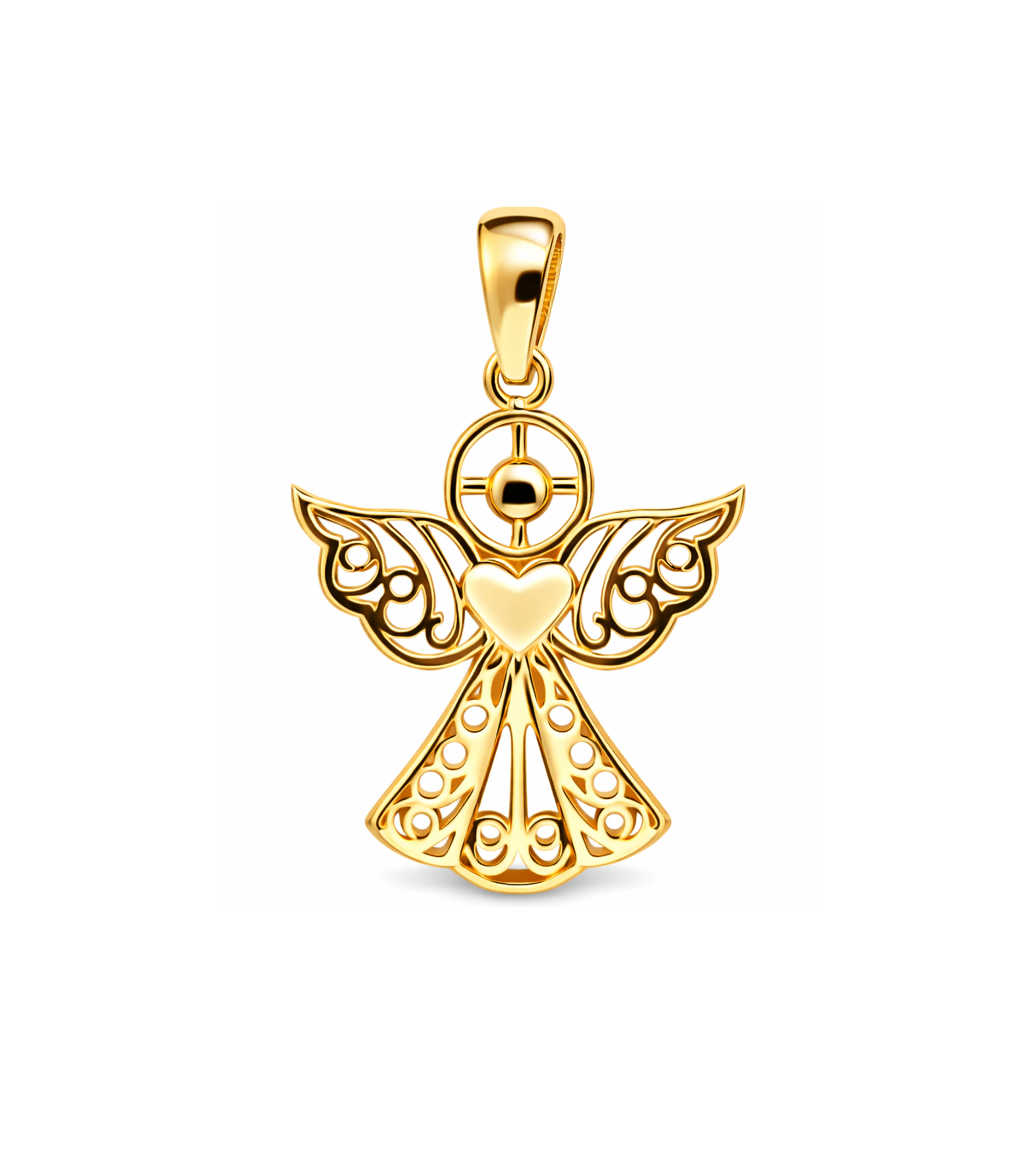 Złota zawieszka próby 585 w kształcie aniołka trzymającego serce. Piękny, ażurowy wzór, idealny prezent na Chrzest, Komunię lub Bierzmowanie. | Akebia