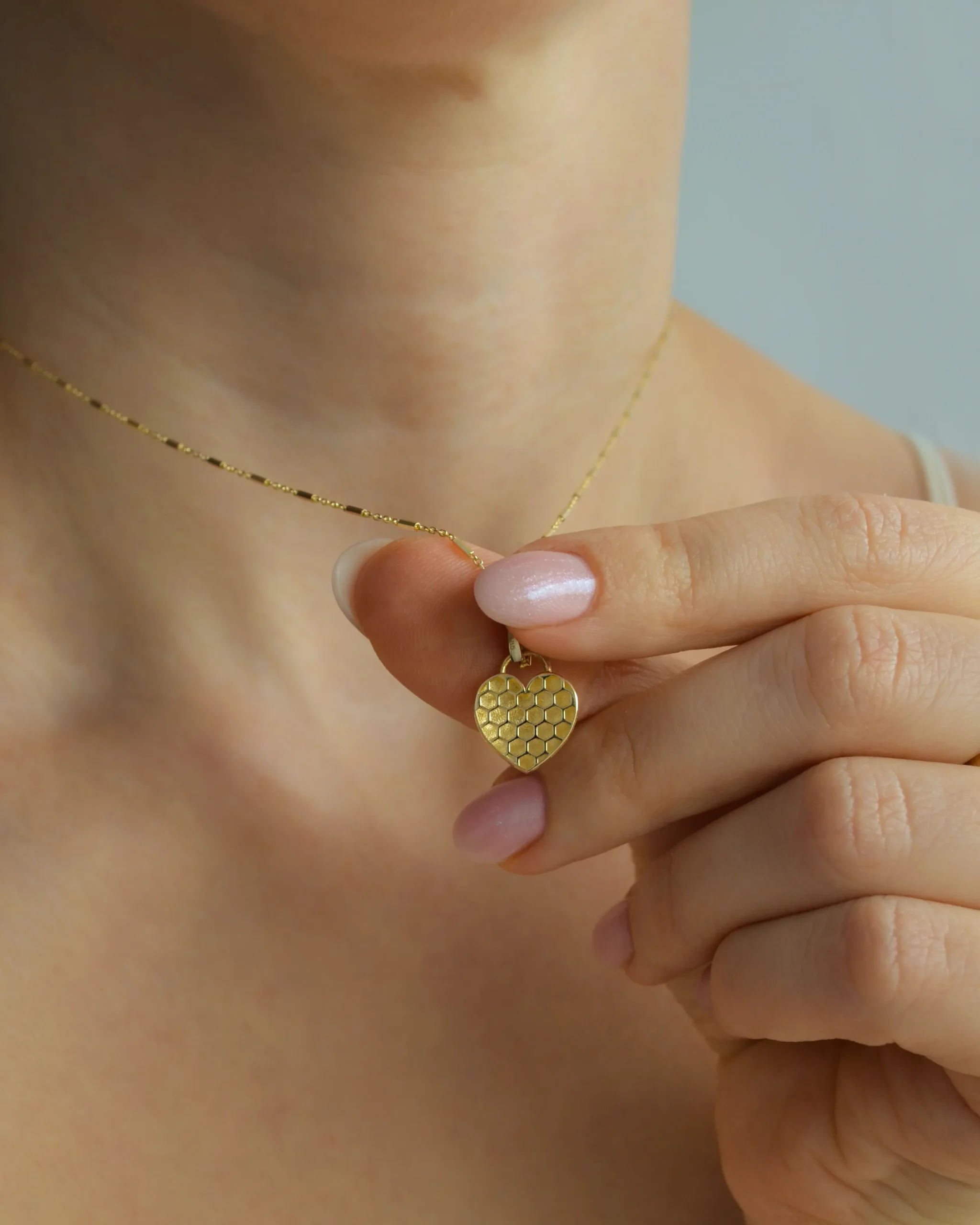 Jej przednia strona zachwyca idealnie gładką, lustrzaną powierzchnią o mocnym połysku, natomiast z tyłu znajduje się ażurowy wzór przypominający plaster miodu. Dzięki temu zawieszka pięknie wygląda z każdej strony, niezależnie od tego, jak się ułoży podczas noszenia.