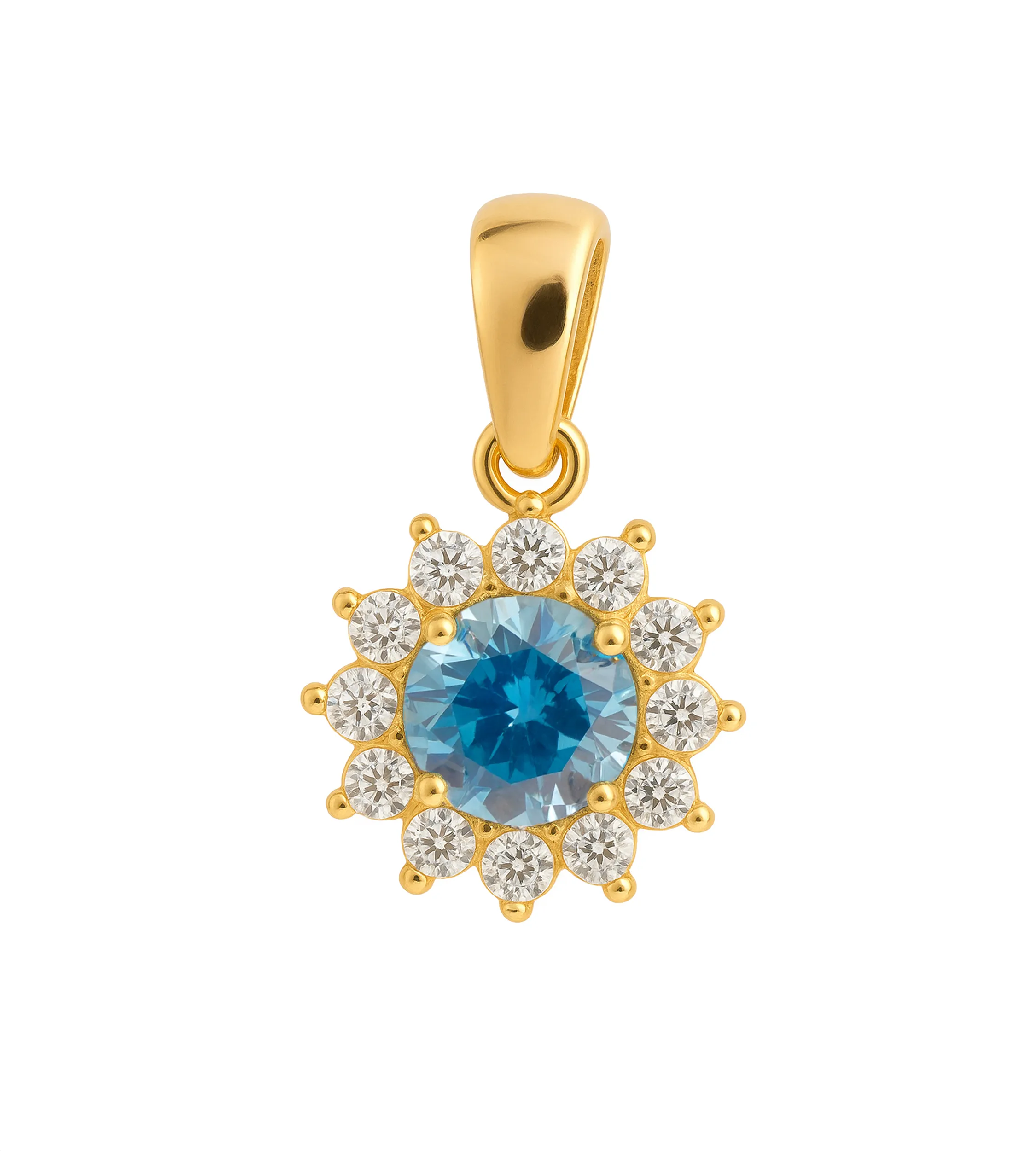 Elegancka złota zawieszka próby 585 z błękitnym kamieniem i cyrkoniami. Luksusowy wybór na prezent – idealna na ślub, święta czy wyjątkowe okazje.