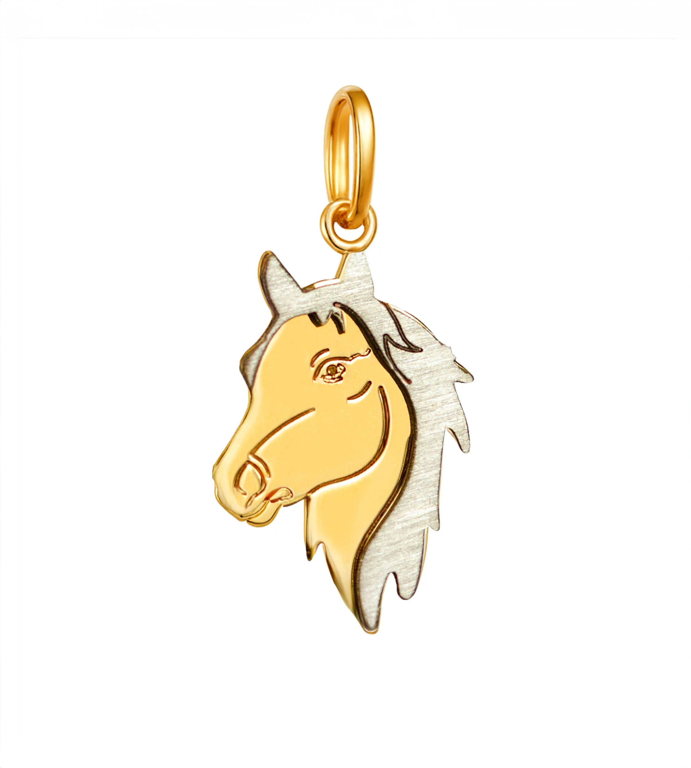 Złota zawieszka w kształcie głowy konia – precyzyjnie wycinana laserowo, realistyczna, z pięknym kontrastem dwóch odcieni złota. Głowa wykonana jest z żółtego złota próby 585, natomiast grzywa – misternie wykończona białym złotem – dodaje kompozycji głębi i charakteru. Całość jest dodatkowo grawerowana, co podkreśla detale anatomiczne i nadaje zawieszce szlachetny, niemal rzeźbiarski wygląd.