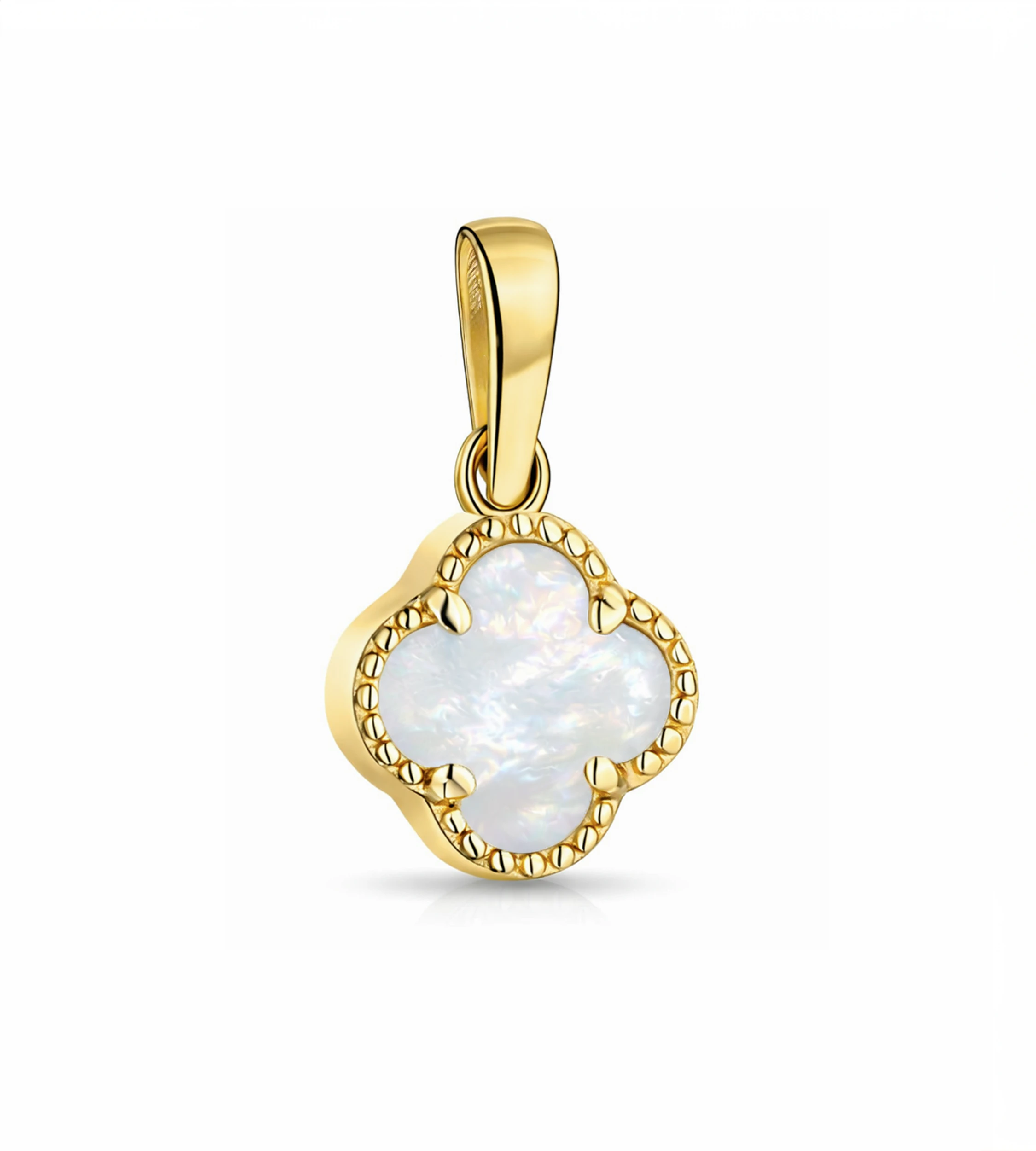 Złota zawieszka koniczynka z masą perłową. Symbol szczęścia w eleganckiej oprawie ze złota 585. Delikatny i ponadczasowy dodatek. Sprawdź w Akebia!