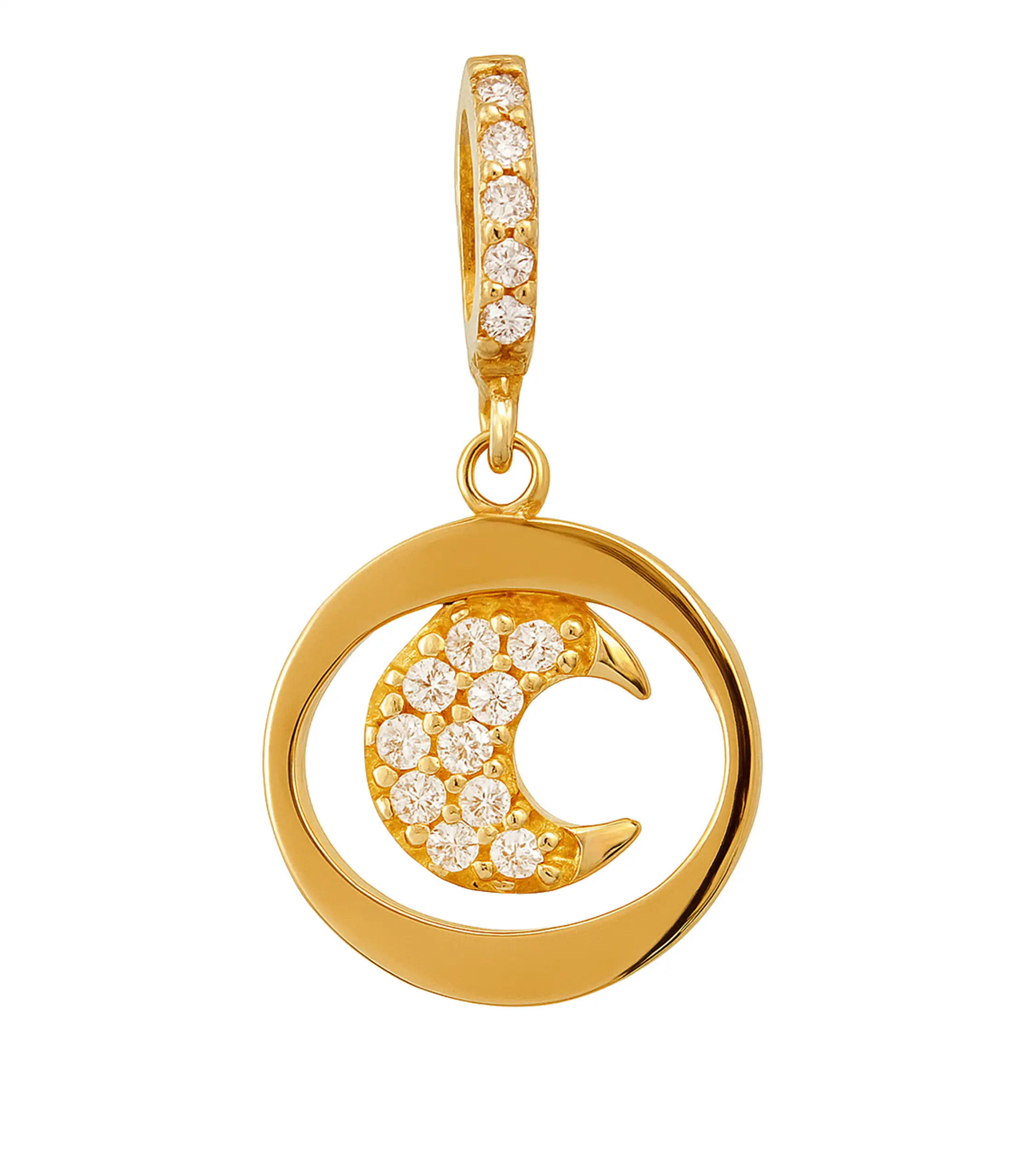 Złota zawieszka 585 z księżycem wysadzanym cyrkoniami. Subtelna i symboliczna biżuteria – z ozdobnym detalem przy uchwycie. Idealna na prezent.