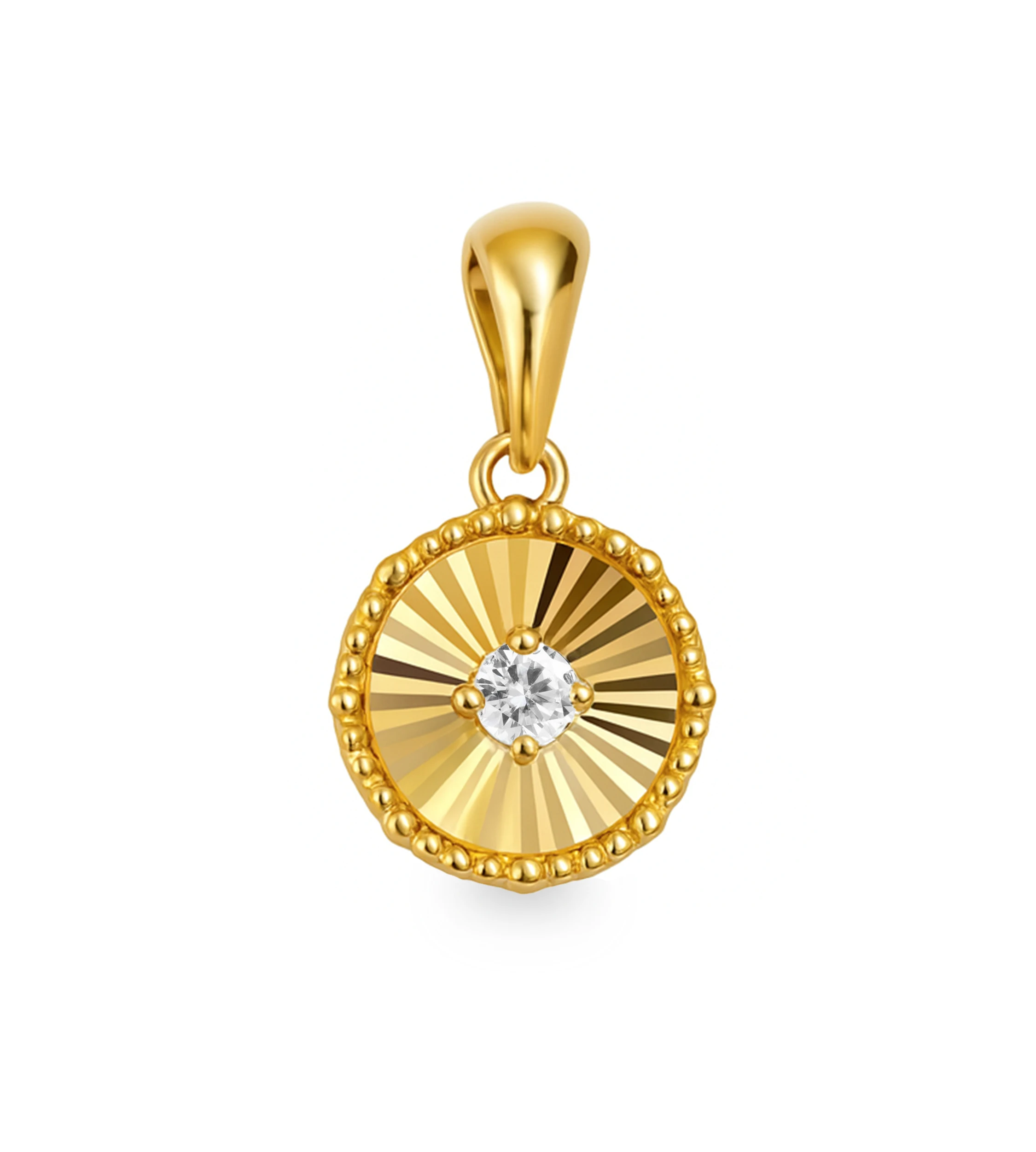 Zawieszka ze złota 585 w formie subtelnego, pełnego kółka to klasyka w nowoczesnym wydaniu. Jej powierzchnia została wykończona promieniście ułożonym diamentowaniem, które pięknie łapie światło i subtelnie mieni się przy każdym ruchu. W centrum znajduje się maleńka, osadzona cyrkonia – drobny detal nadający całości eleganckiego wykończenia.
