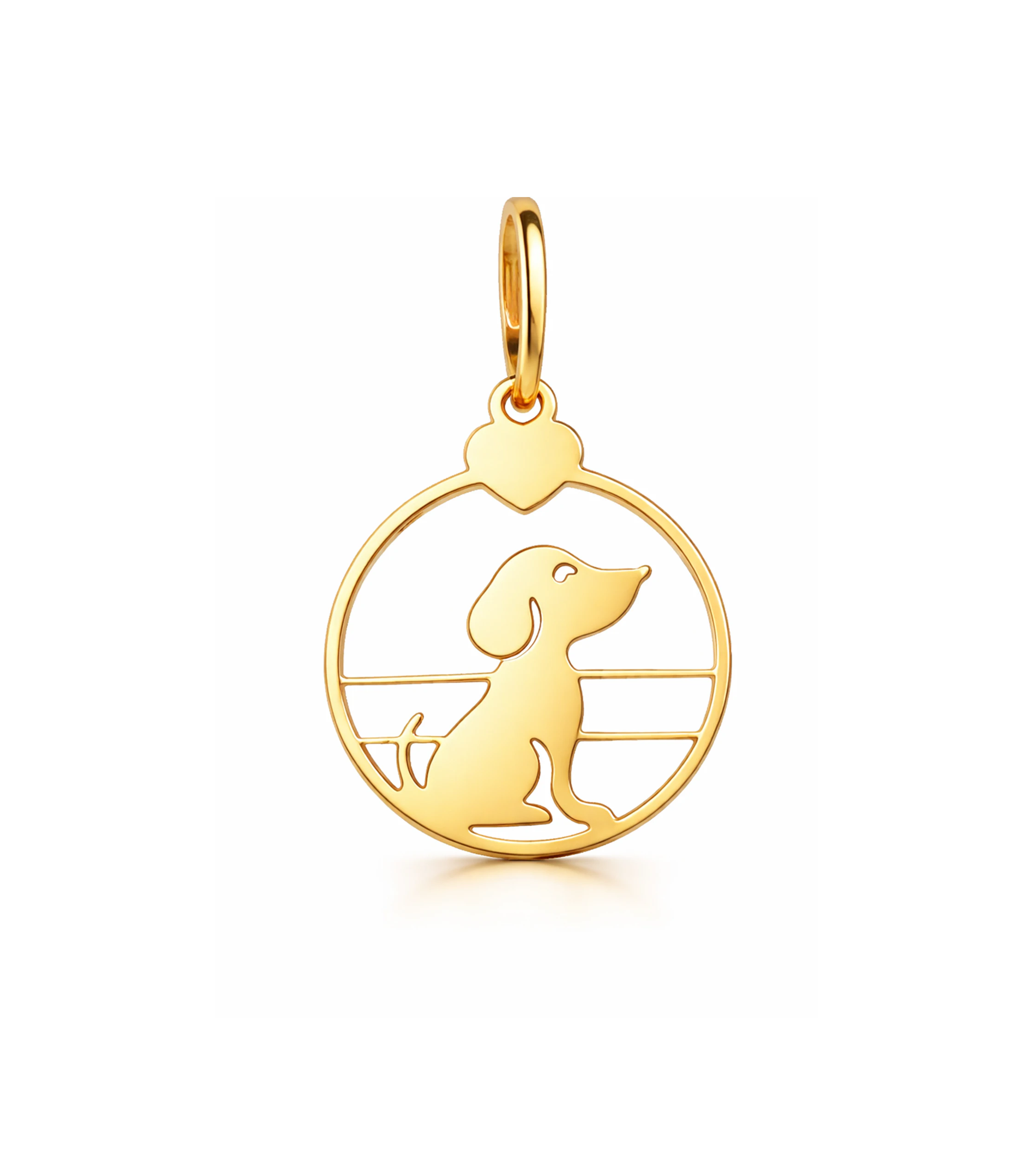 Złota zawieszka w kształcie siedzącego pieska umieszczonego w kółeczku. Delikatna, symboliczna i idealna dla miłośników psów.