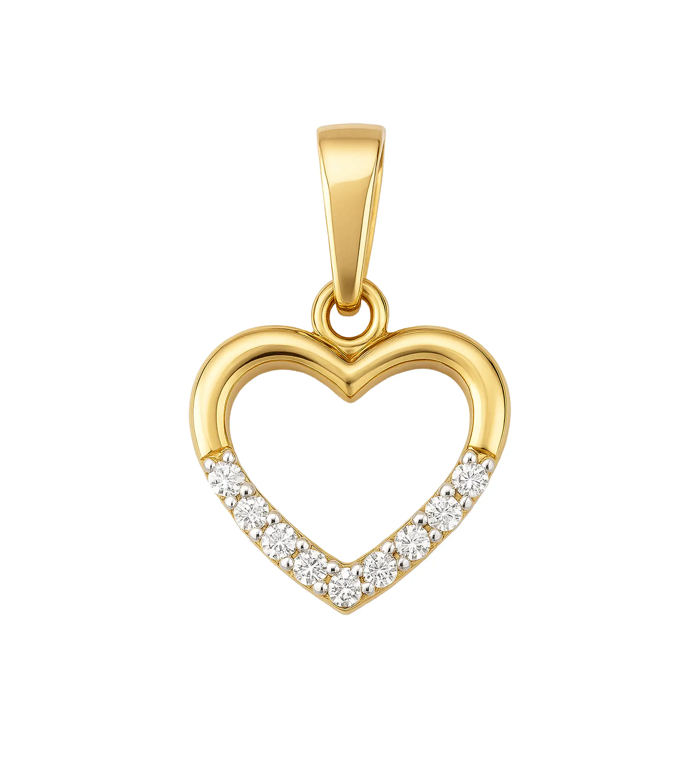 Elegancka zawieszka w kształcie otwartego serca, wykonana ze złota 585. Złoto w wysokim połysku, wymiary serca 9 x 8 mm, długość całkowita z oczkiem do zawieszania: 1,5cm.
