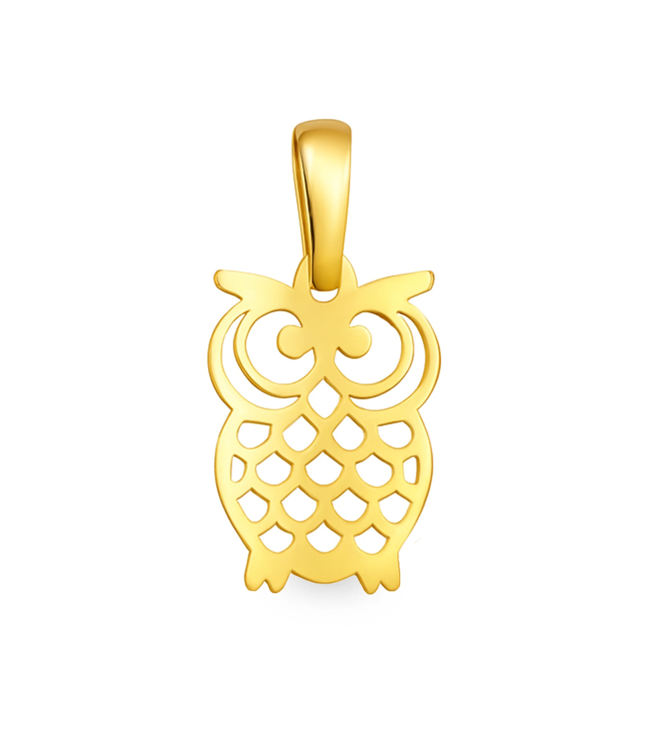 Złota zawieszka próby 585 z motywem sowy zachwyca lekkością formy i starannością wykonania. Ażurowa konstrukcja pozwala światłu swobodnie przenikać przez misternie wycięte detale – duże oczy, charakterystyczny dziób oraz stylizowane pióra na brzuchu. Zawieszka jest subtelna, a jednocześnie pełna charakteru. Sowa została ukazana frontalnie – z delikatnym konturem uszu i symetrycznie rozmieszczonymi wycięciami, które dodają jej dekoracyjnego wyrazu.