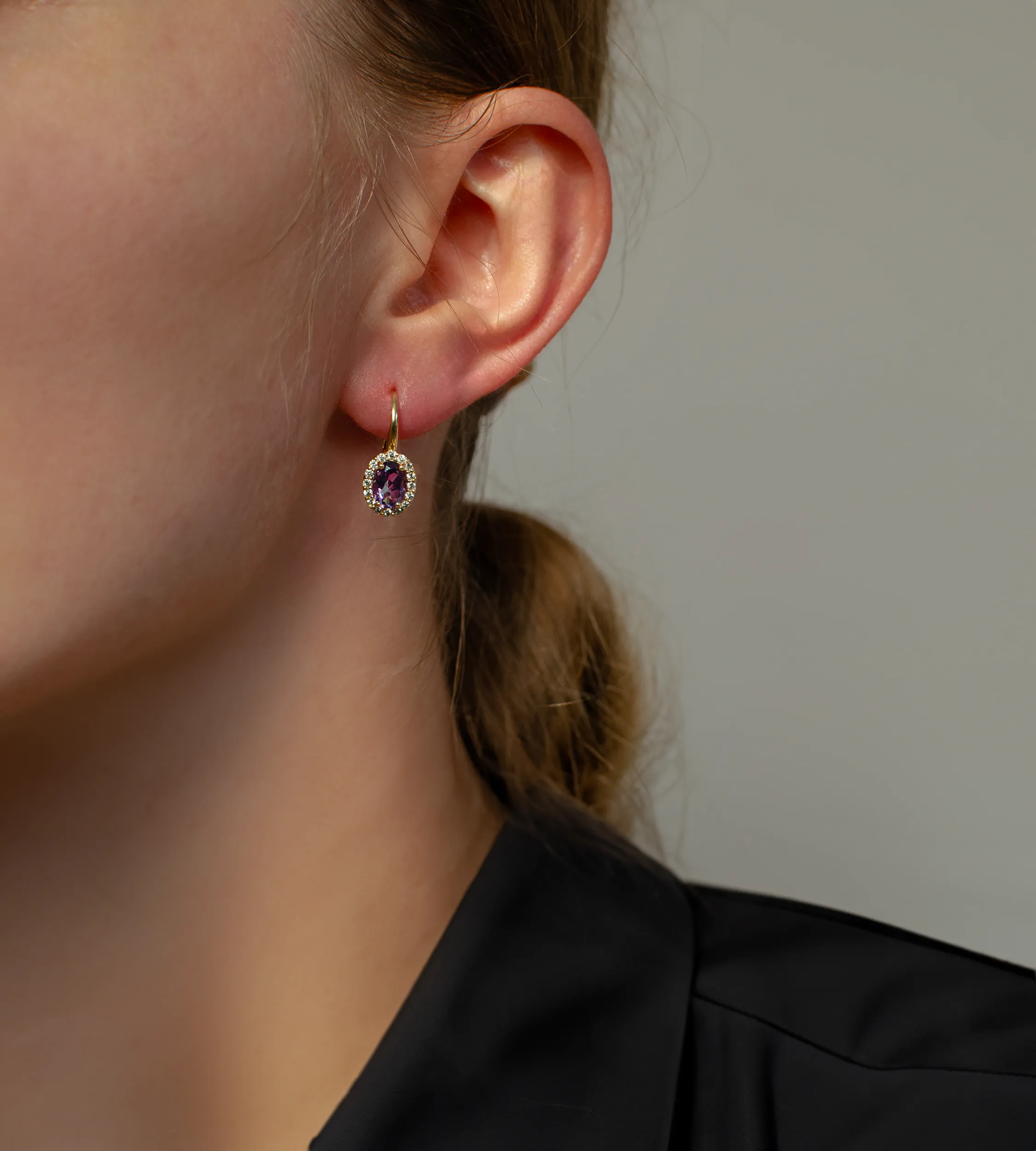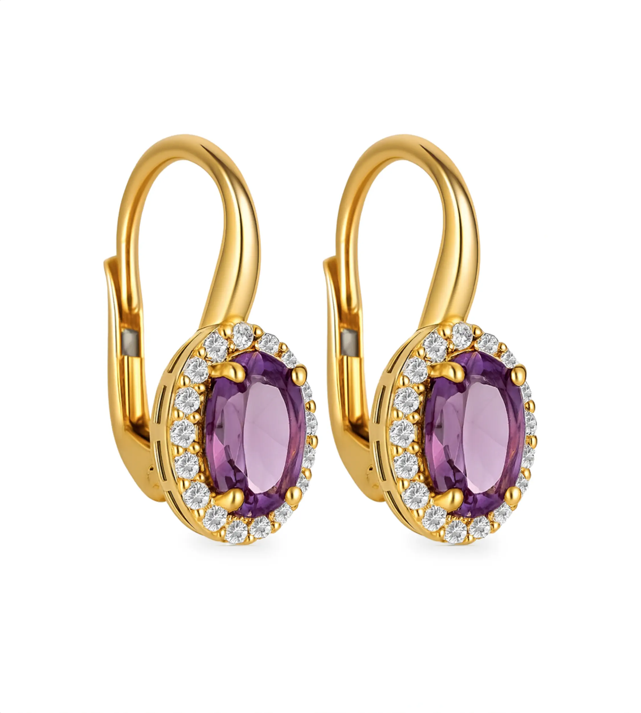 Złote kolczyki próby 585 z zapięciem angielskim to biżuteria dla kobiet ceniących ponadczasową elegancję i subtelny luksus. Kolczyki mają kształt markizy o długości całkowitej około 18,5 mm, a ich centralnym elementem jest naturalny ametyst w formie owalu o wymiarach 7,1 x 5,1 mm. Kamień główny otoczony jest wianuszkiem drobnych, białych cyrkonii, co nadaje kolczykom delikatnego blasku i wyjątkowego charakteru.