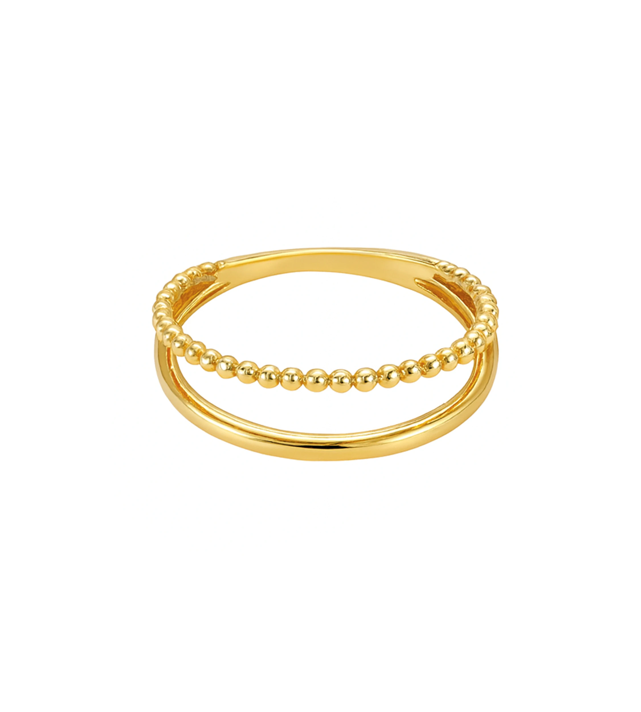 Złoty pierścionek podwójny z kuleczkami to klasyka w nowoczesnym wydaniu – lekki, kobiecy i wyjątkowo elegancki.