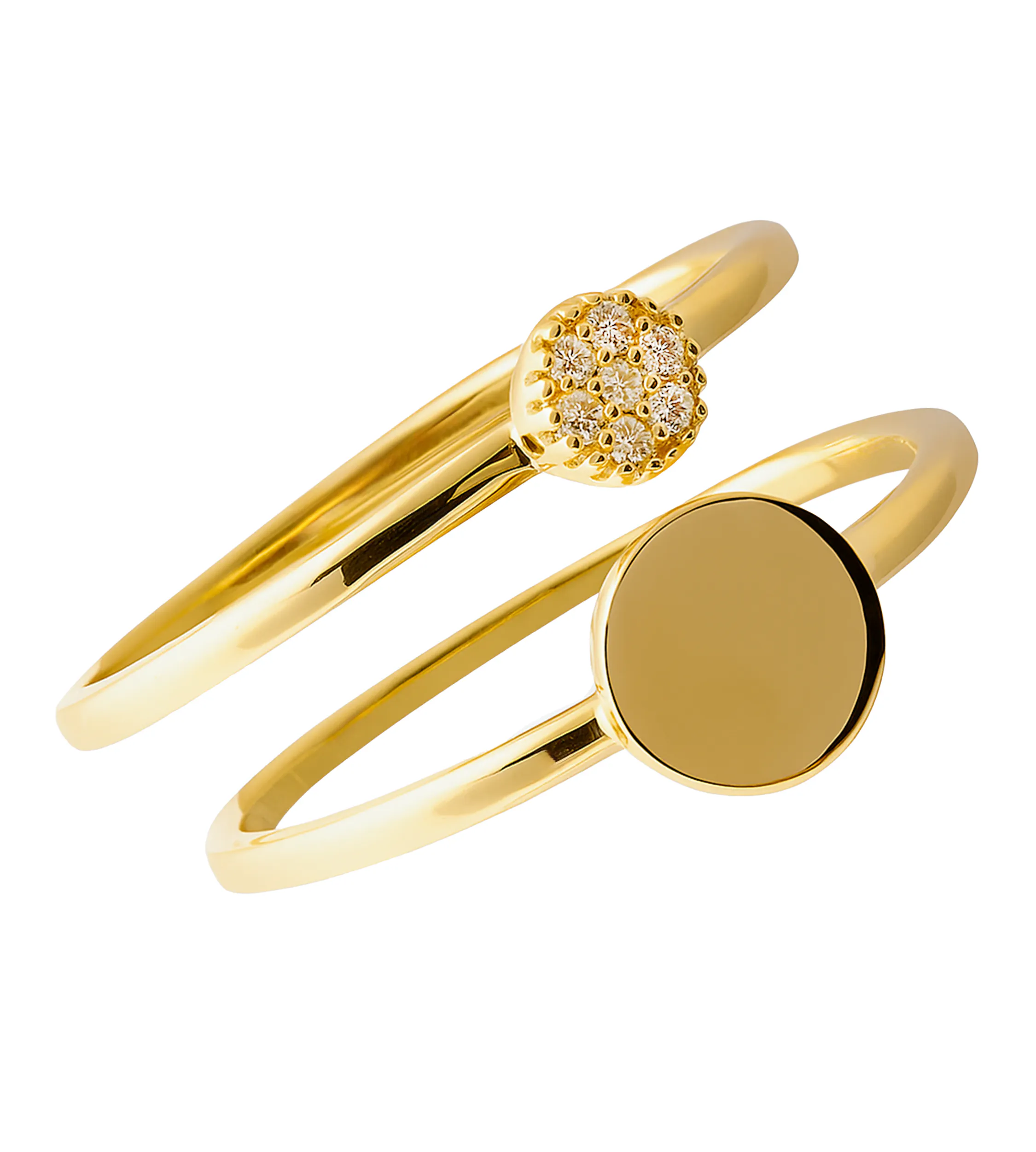 Złoty pierścionek próby 585 to nowoczesny duet, który daje pełną swobodę stylizacji. Składa się z dwóch oddzielnych, żółtozłotych pierścionków – jeden zdobi gładkie, minimalistyczne koło, a drugi delikatne kółko wysadzane drobnymi cyrkoniami. Razem tworzą harmonijny, lekki komplet, który podkreśla naturalną elegancję dłoni.